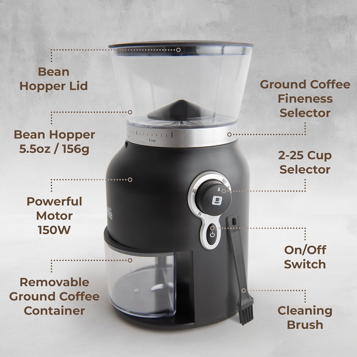 Kaffe Electric Burr Coffee Grinder (5.5oz) – Conical Burr – 25 Adjustable Coarseness Levels – Matte Black – Cleaning Brush Included