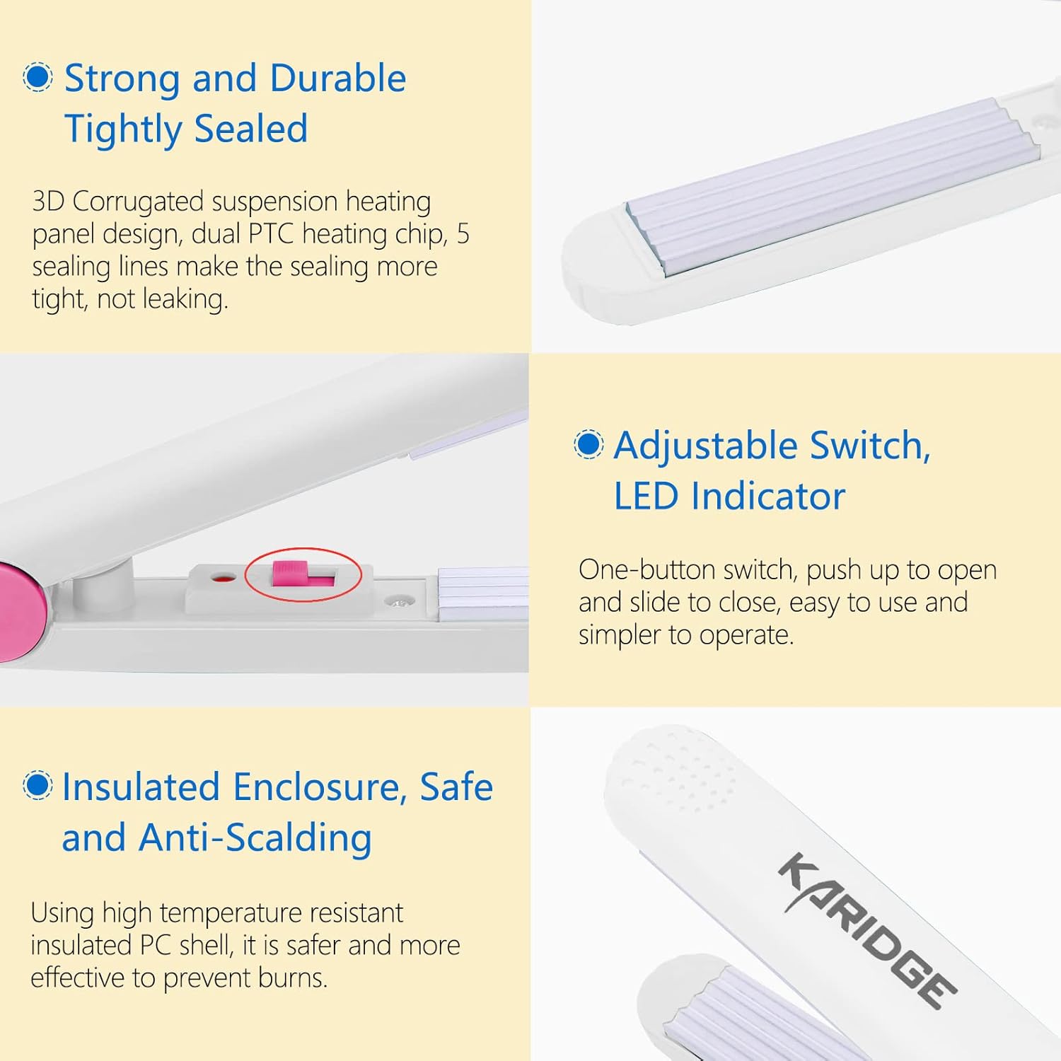 It’s not a hair straightener or curling iron, it just looks similar.. Please don’t use it to straighten or curl your hair to avoid damage to your hair.Do not touch the heating pad when using it, keep away from children and avoid burns.Do not heat for a long time, please turn off the power button in time when not in use to avoid burning the heat sealer. Your safety and satisfaction is our main concern!