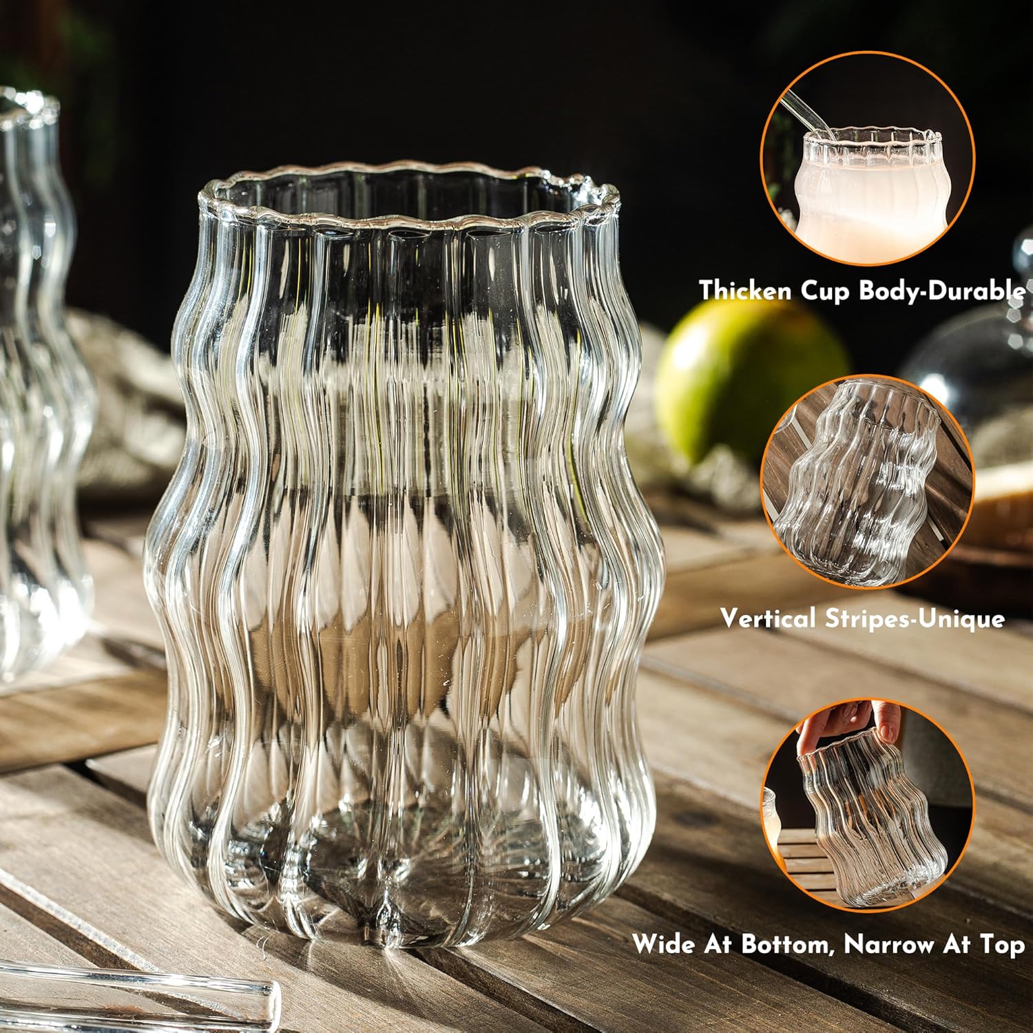 【ENHANCED DRINKING PLEASURE】18 oz glass cup set includes 4 wave shaped glass cups, 4 bamboo lids, 4 glass straws and 2 cleaning brushes. Its design features smooth and beautiful contours that resemble waves, Can meet the needs of repeated use, very practical combination set.Shine up Your Home Table Party Decor.