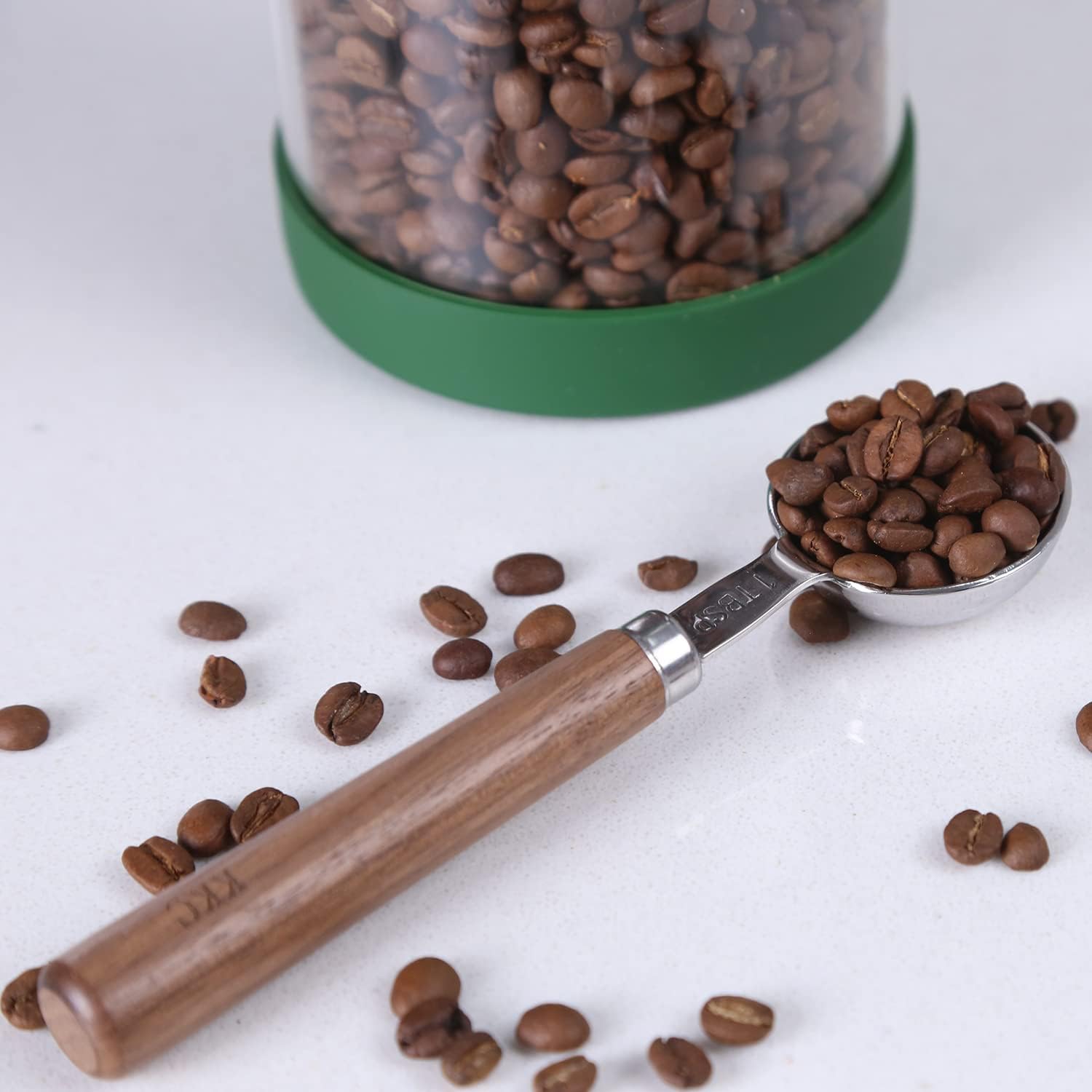Ken‘s Kitchen Coffee Canister with Scoop, Airtight Glass Coffee Bean Storage Container with Non-slip Mat and Holder for Coffee Bean, Ground Coffee,Nuts, Cookie, Cereal,Flour, 40OZ,Green