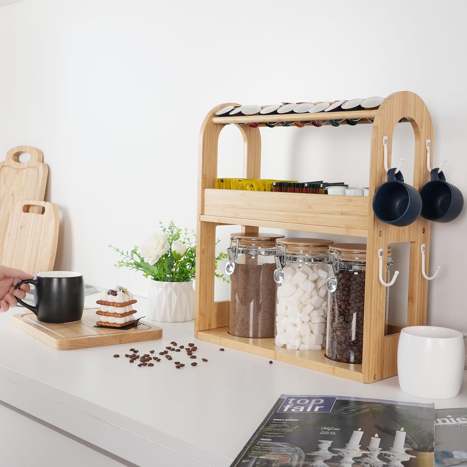 Multi-Level Bamboo Organization: The bamboo rack (15.3″ L x 6.2″ W x 17.7″ H) Holds 3 jars, 20 capsules, has 3 compartments and 4 hooks – ideal for coffee, tea, sugar, and accessories.
