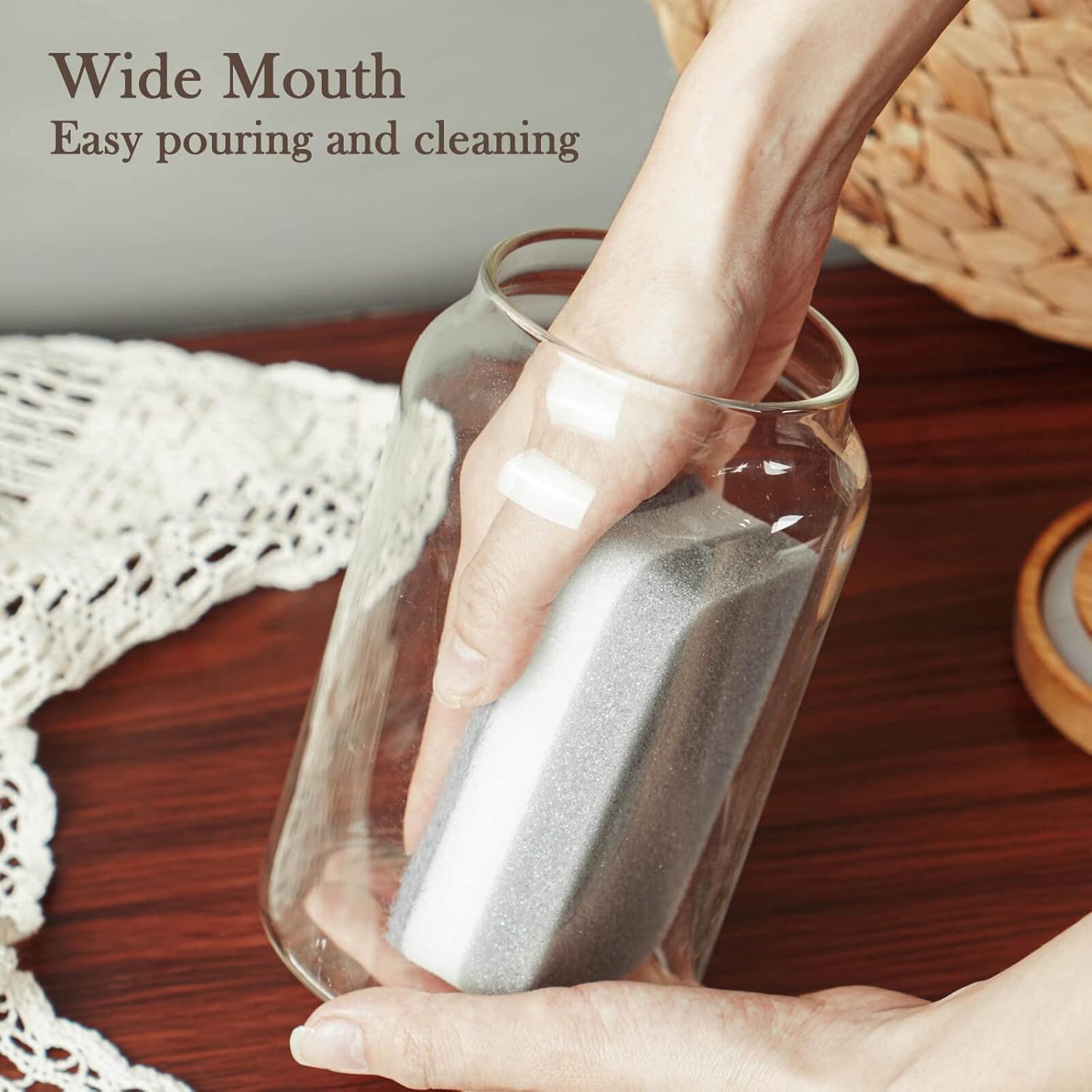 WIDE OPENING – The glass food storage containers are designed as opening wide for pouring pasta or snacks, and the wide opening also allows a scoop or measuring cup to fit inside. You can easily pouring and cleaning these kitchen canisters.