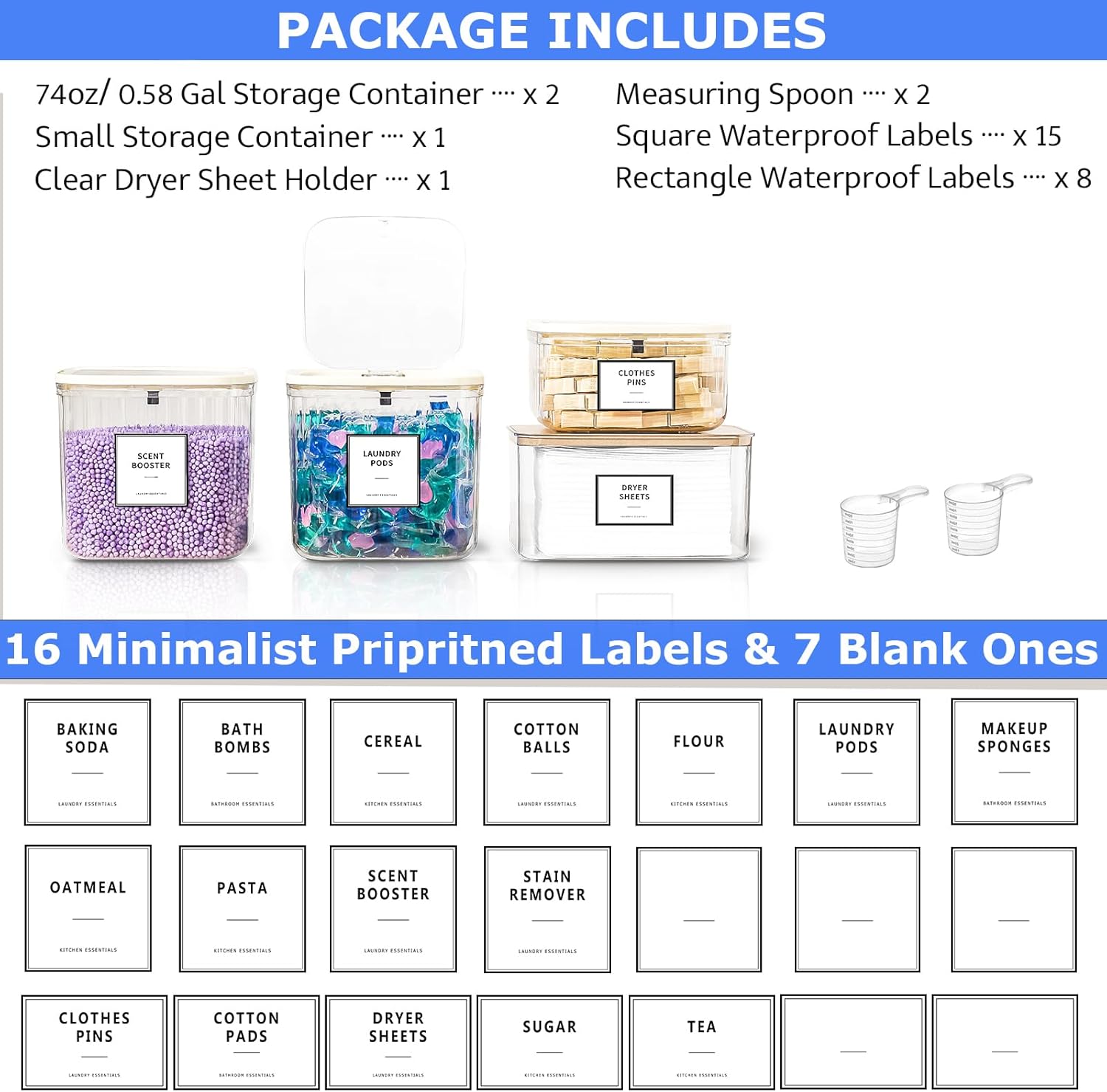All-in-One Set Laundry Room Organization: The 4 pack laundry room organization includes: 2.2L laundry pods containers x 2, dryer sheet holder x 1, small wooden clothespins container x 1, measuring spoon x 2, waterproof labels x 23. Perfect for storing laundry powders, laundry beeds, scent boosters, stain remover, dryer sheets, clothes pins, and even food in your kitchen.