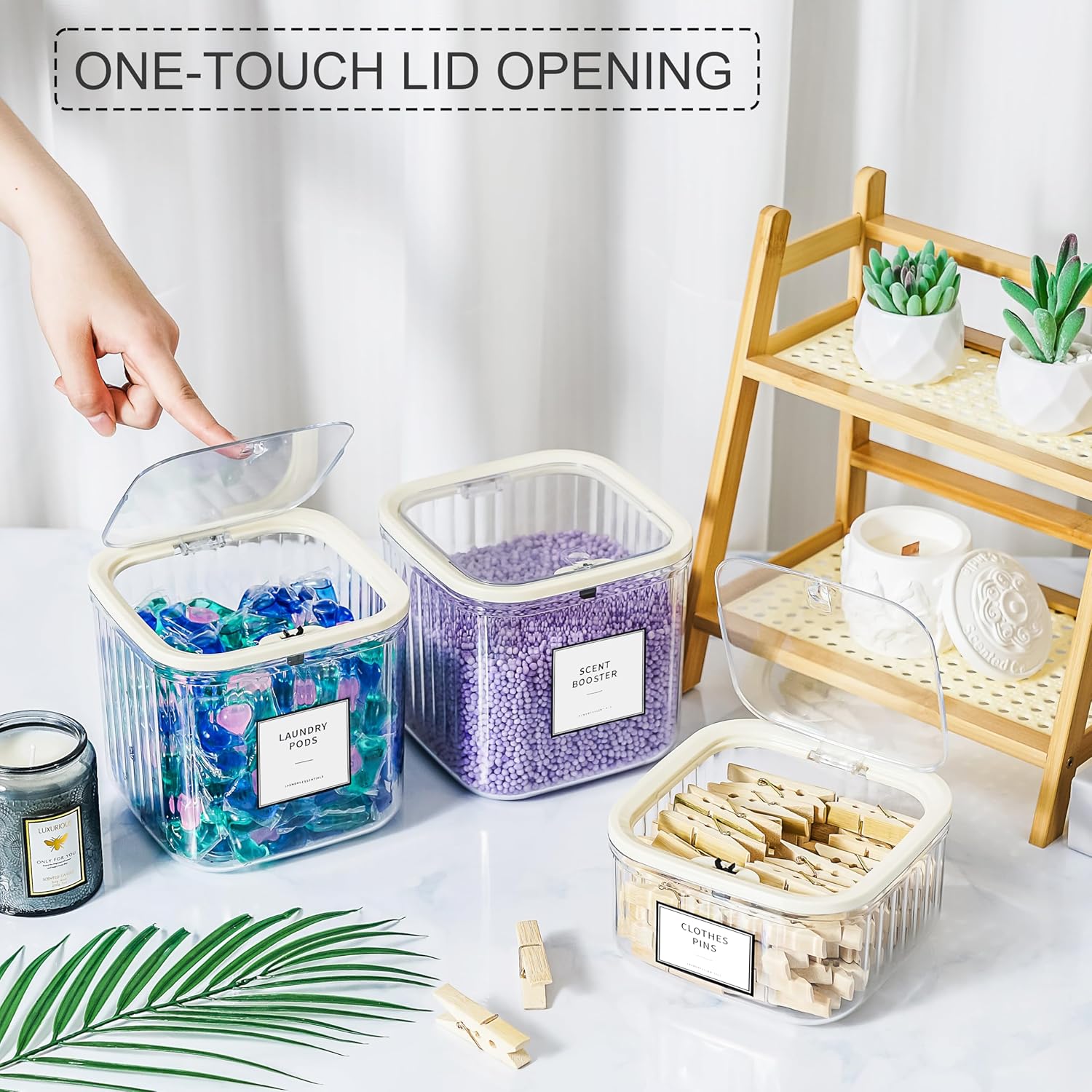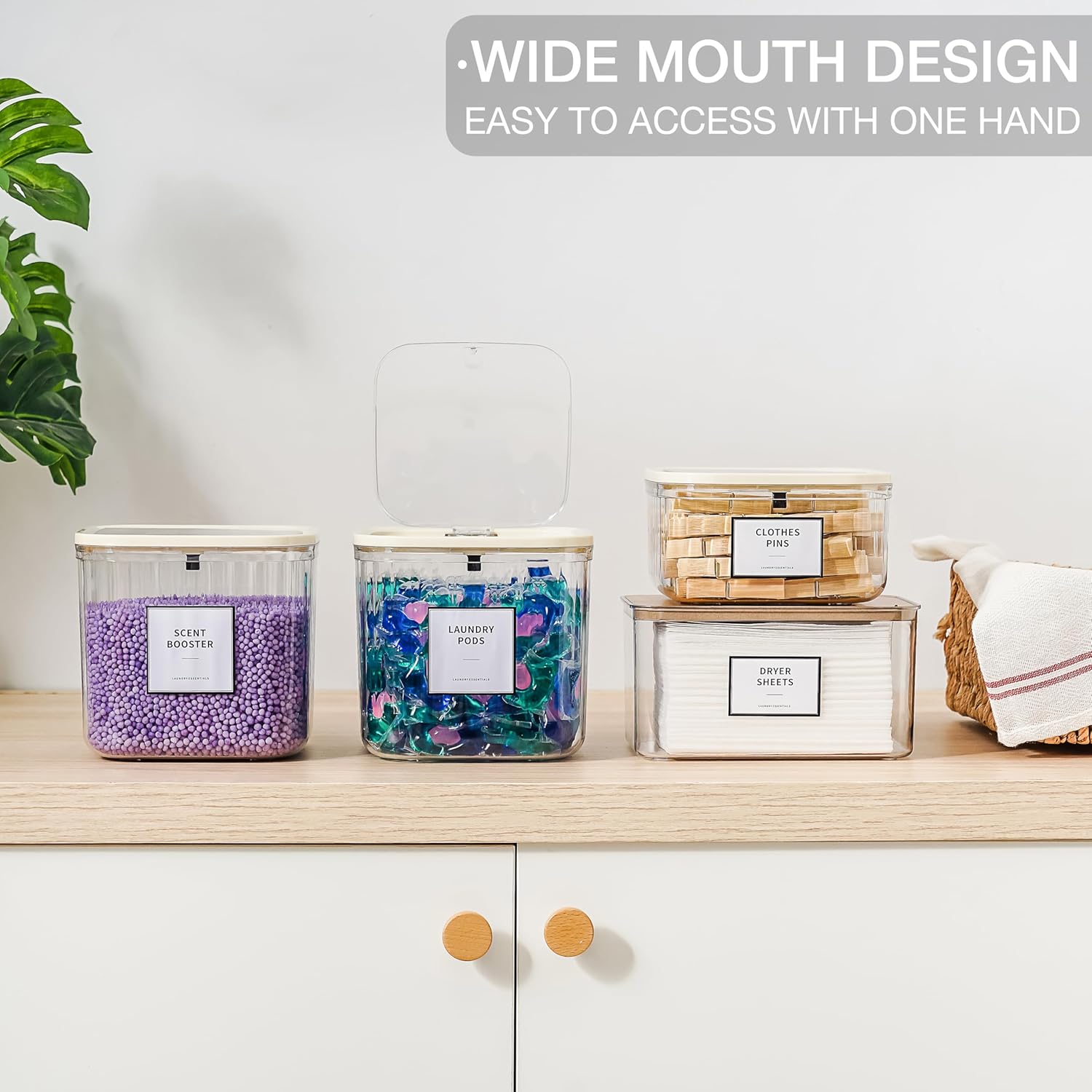Storage Everything with These Reusable Containers: Ideal for storing laundry pods, powder, scent booster, makeup sponges, even food such as pasta.One-Touch Lid & Wide Mouth Design: Just push the button and get everything inside. The wide mouth design allows easy fill and refill. Maximize the laundry room’s efficiency.4 Pack Containers Meet Your Daily Needs: The package includes clear containers x 2, wooden Clothespins container x1, dryer sheet holder x1, measuring spoons x2, waterproof label x 23.