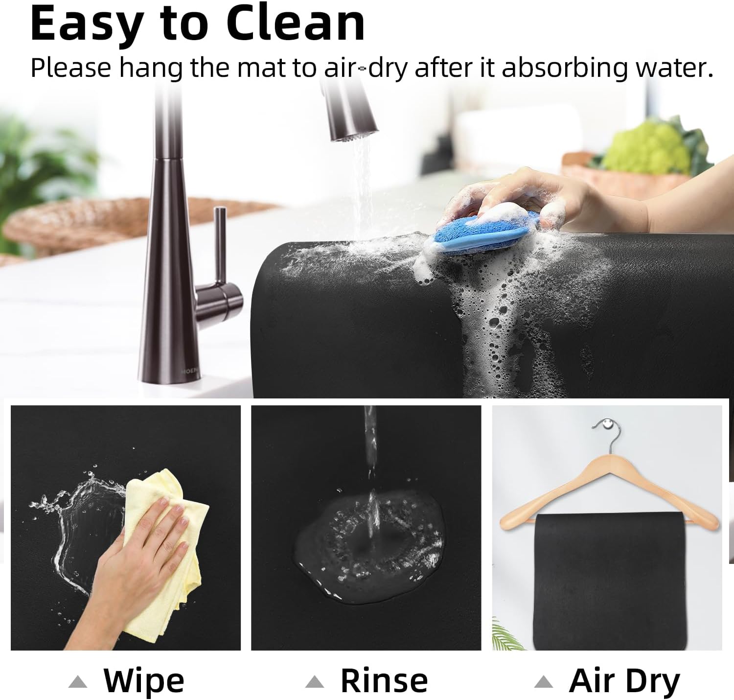 Fast Drying: Put the dishes or pans on drying mat for kitchen counter, all dinnerware will dry quickly. If the fast drying mat absorb a little of water, it will self air dry quickly. If the kitchen counter mat absorb plenty of water, just squeeze out the water and hang to air dry