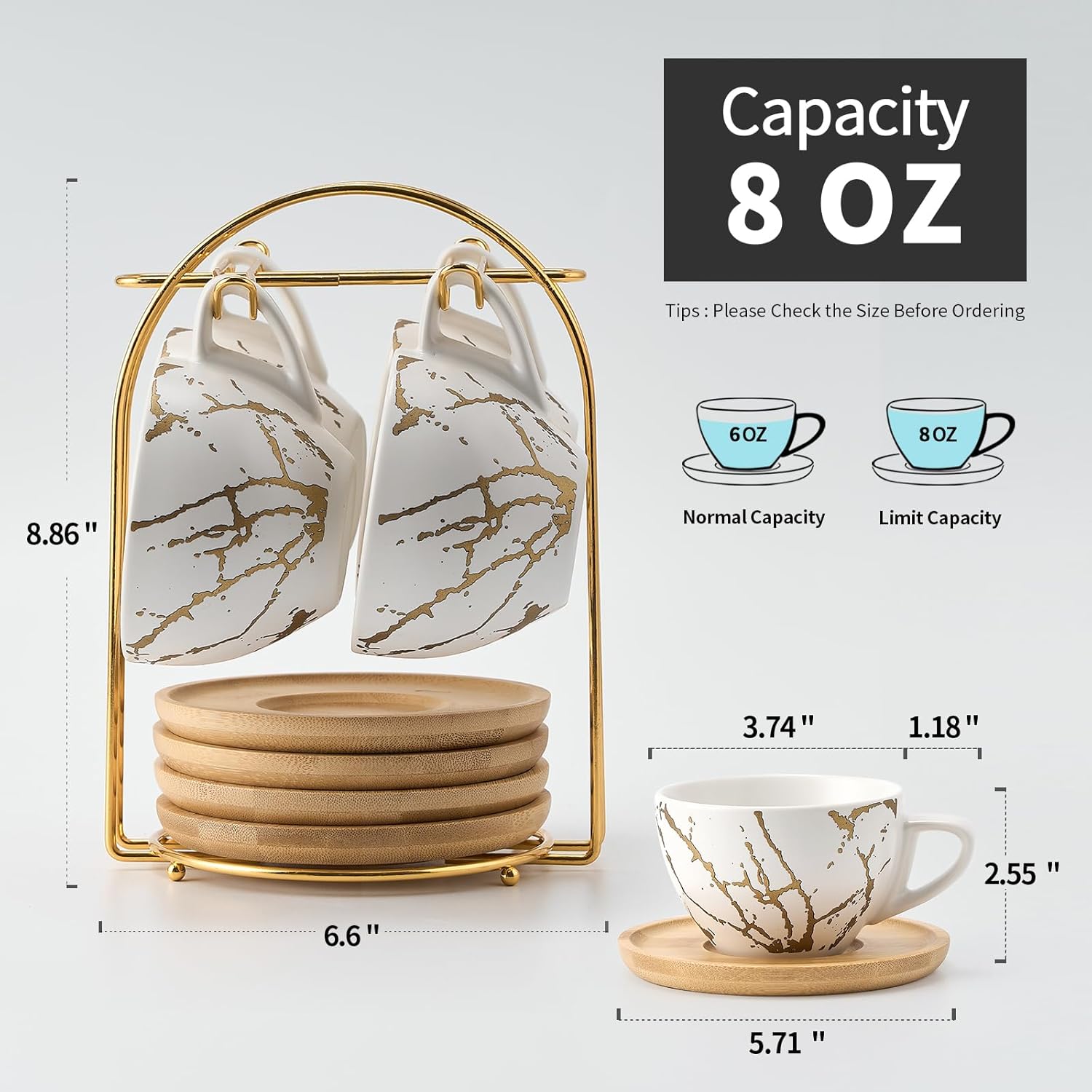 【SAVE COUNTER SPACE】 Each Cup: Dia:3.74″, H:2.56″. Capacity(full): 8oz /237 ml. Each saucer: Dia:4.92 “, H:0.5 “.The combination of the coffee cup set and the iron frame can prevent the cups and saucers from being randomly placed.They are the best collocation in your life.