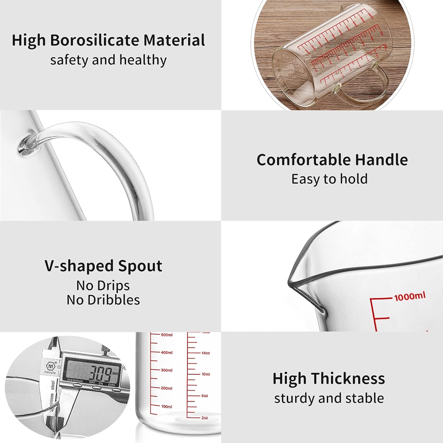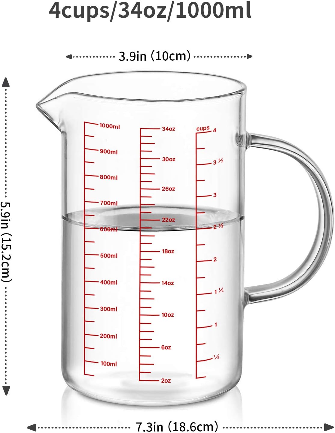 Luvan 34OZ/1000ML Glass Measuring Cup, 4 Cup Glass Measuring Cup With 3 Scales (Ml/Oz/Cup), High Borosilicate Glass Measuring Cup With Handle and V-Shaped Spout, Dishwasher/Freezer/Microwave Safe