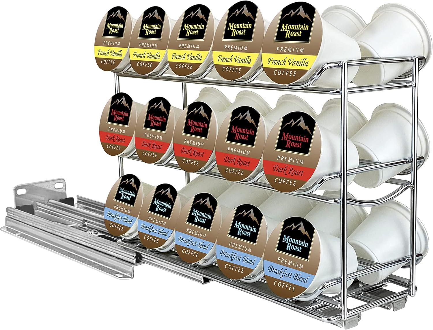 Easy slide-out access for K-Cups hiding in kitchen cabinets, pantries, drawers, and cluttering up countertops. Compatible with Keurig K-Cup coffee pods.