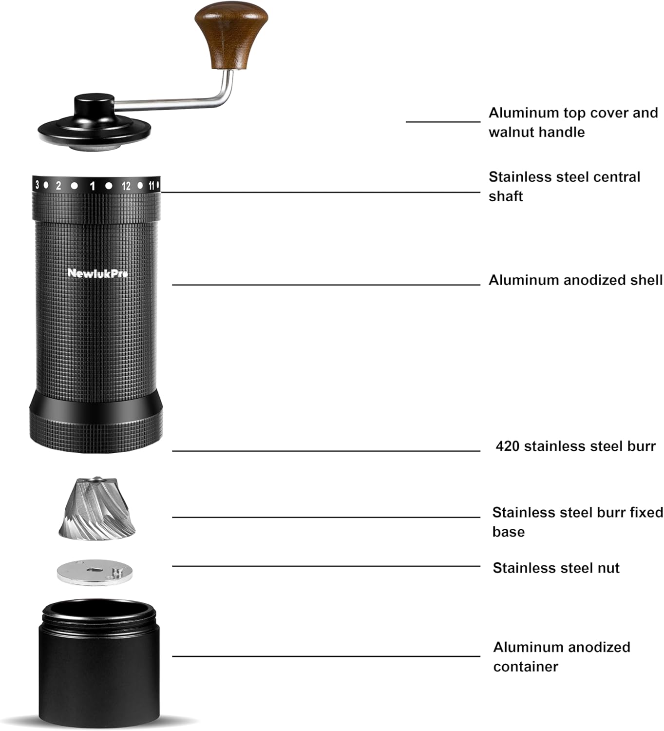 Upgrated Of Core Components : NewlukPro bean coffee grinder has sharp SUS 420 Heptagon core,firm tri bearing axis & comfortable walnut handle.It saves physical strength & outputs evenly coffee powder.This manual coffee grinder has consistent uniform grinding & high grind efficiency,great for Pour Over,AeroPress,French Press or Espresso !