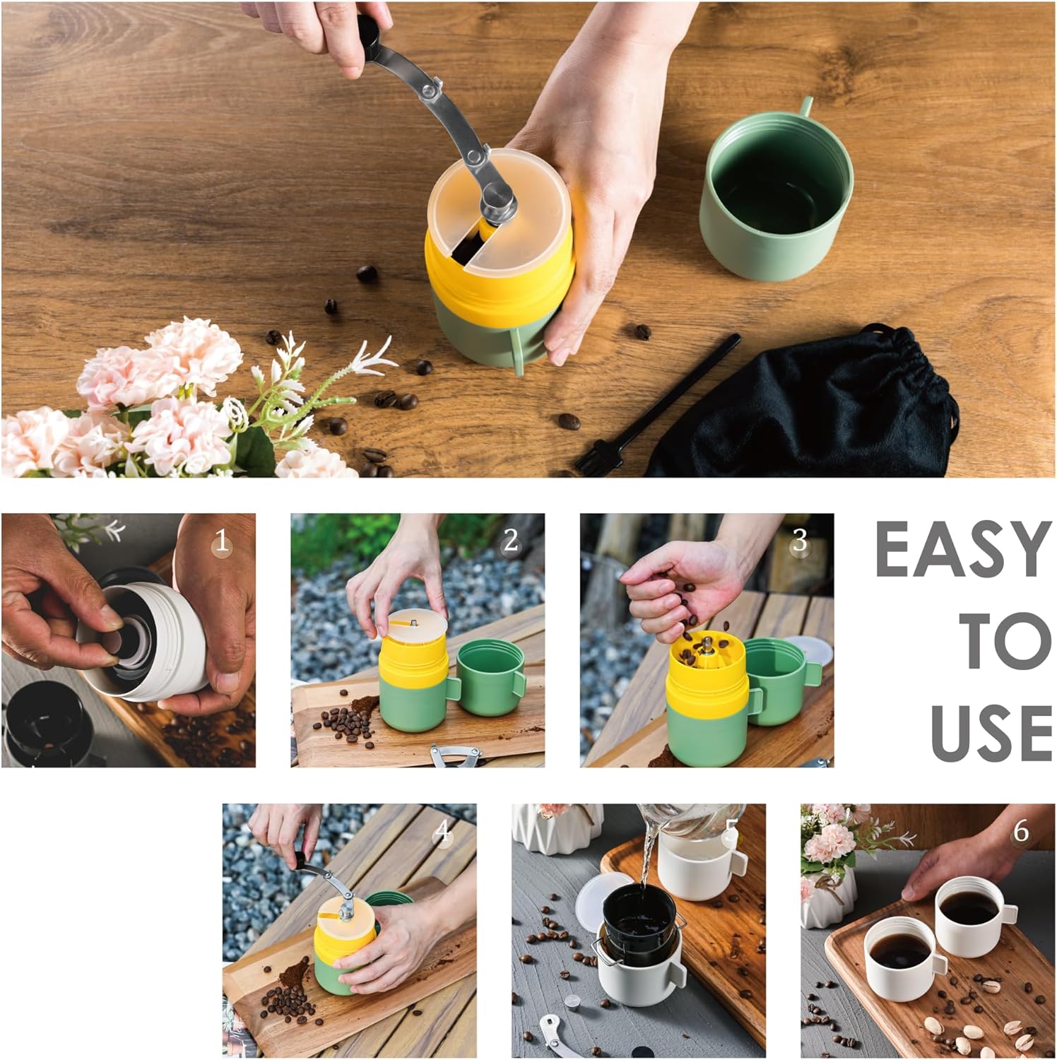 All-In-One Functionality – Unlike other coffee beans grinder, our manual coffee bean grinder is a combination of a portable coffee machine and on-the-go coffee utensils. That’s why our hand coffee grinder comes with two cups, allowing you and your companions to enjoy delicious coffee instantly. Additionally, it is equipped with an ultra-fine stainless steel coffee filter, effectively removing residual grounds during brewing and eliminating the hassle of replacing coffee filter papers.
