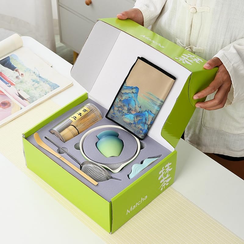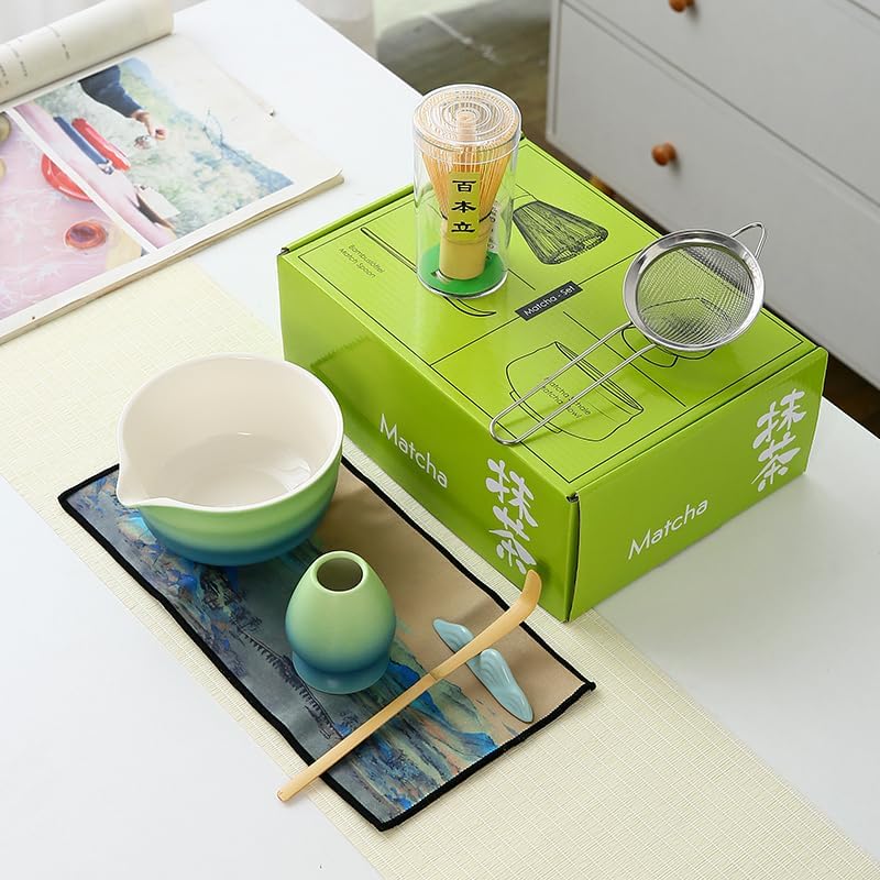 Matcha Set Matcha Whisk Matcha Bowl with Pouring Spout Scoop Matcha Whisk Holder Tea Making Kit, Japanese Tea Set (7pcs) Gradient blue, Color Box Packin