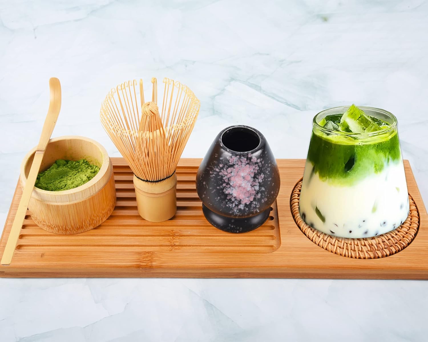 Package Details:High-quality, handmade bamboo whisk and tea scoop, ceramic whisk holder with Black with falling cherry blossom pattern are in traditional Japanese style to prepare perfect matcha with authentic Eastern flavors.