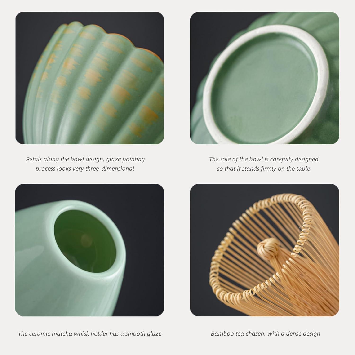 Please Take Heart in the Belly:The matcha bowl form this matcha whisk set collection is a ceramic bowl fired at high temperature, which is not easily broken. At the same time, the inside and outside of the bowl are glazed, and the surface is smooth and easy to clean.The matcha whisk is designed to effectively whisk matcha powder into a smooth consistency,it handmaded from natural bamboo with 100 evenly sized branches which create smooth matcha without clumping.