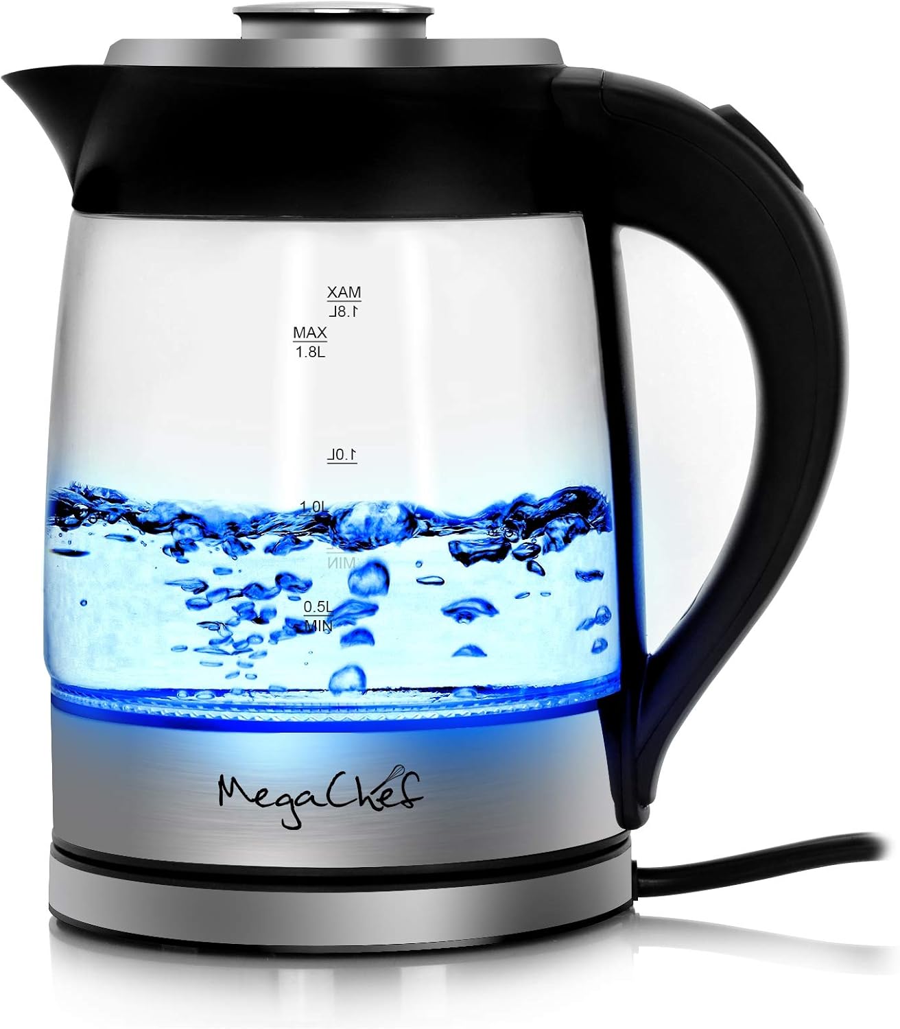 Megachef 1. 8L cordless glass and stainless steel electric tea kettle with tea infuser lets you make all your favorite hot beverages and more. This kettle has a sleek glass design with a stainless steel finish that looks great in any kitchen. See when the water is boiling with the clear glass construction. Heat up water worry free with the Auto shut off feature! This kettle is your one stop tea maker. With the infuser, all you have to do is put your favorite tea Leaves in the infuser for it to brew. Clean up is a breeze with the removable and washable filter, and worry less about messes with the drip-free spout
