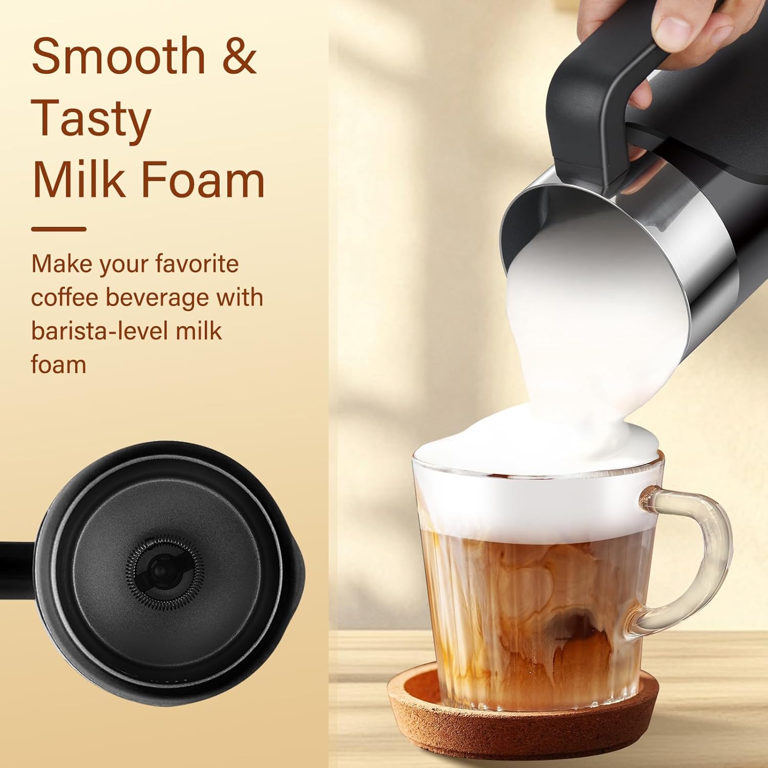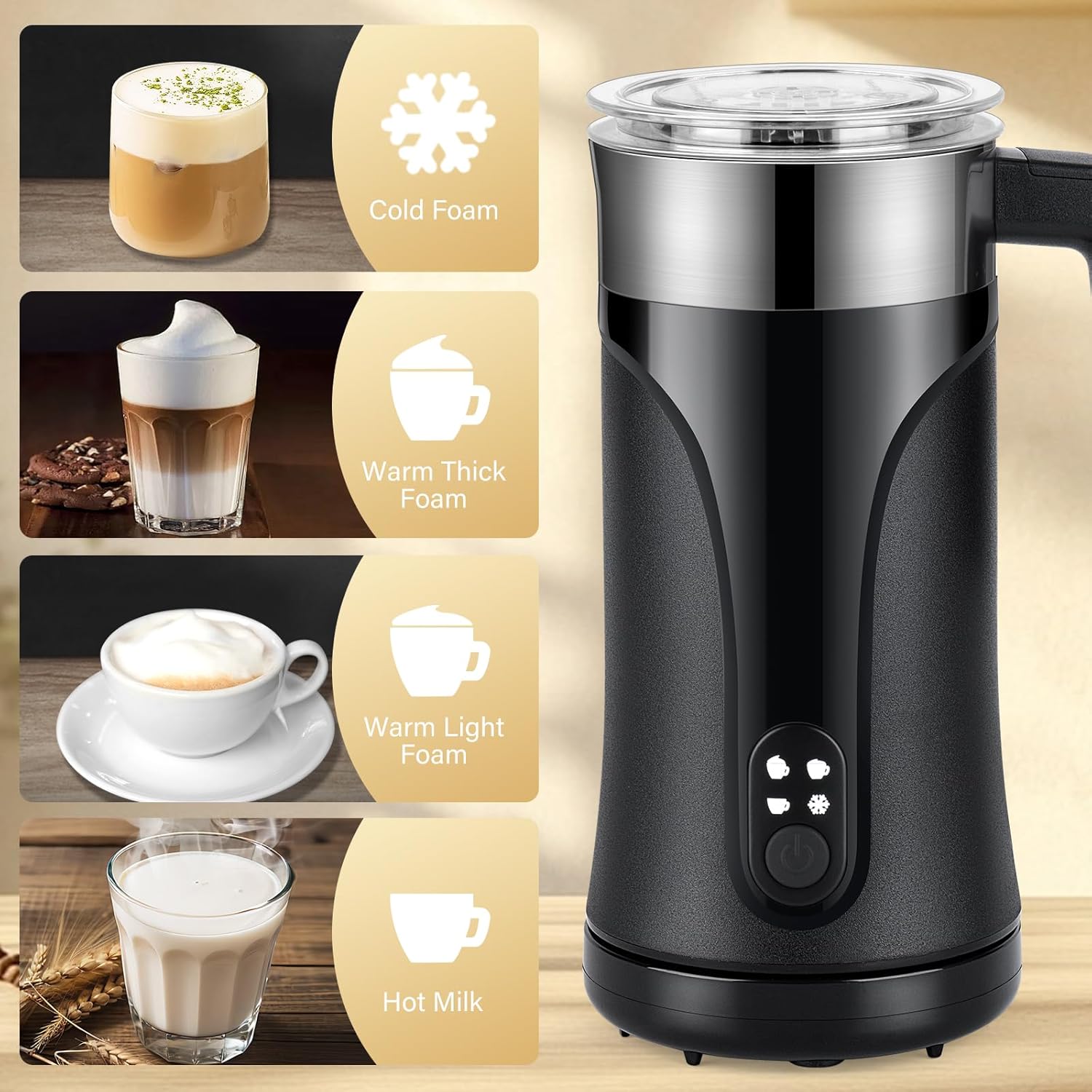 【4 in 1 Multifunctional】Electric coffee frother produces hot dense foam, hot airy foam, hot milk and cold froth, you can DIY your favorite coffee beverage with barista-Level milk foam.
