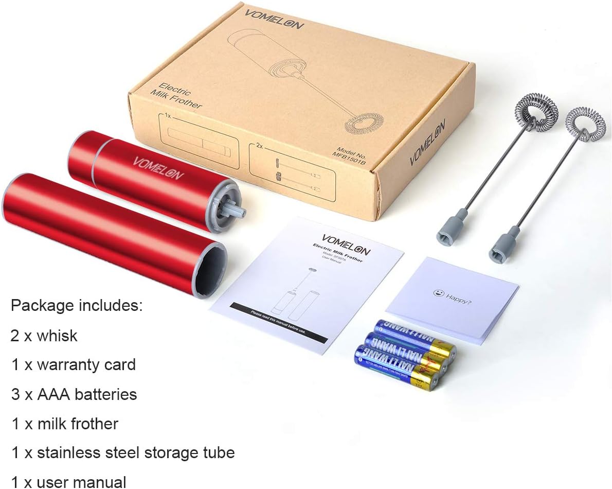 Milk Frother Handheld, Battery Operated Coffee Foamer Drink Mixer with 2 Stainless Steel Electric Whisks for Coffee, Latte, Cappuccino, Hot Chocolate, Protein, Batteries Included, Ruby Red