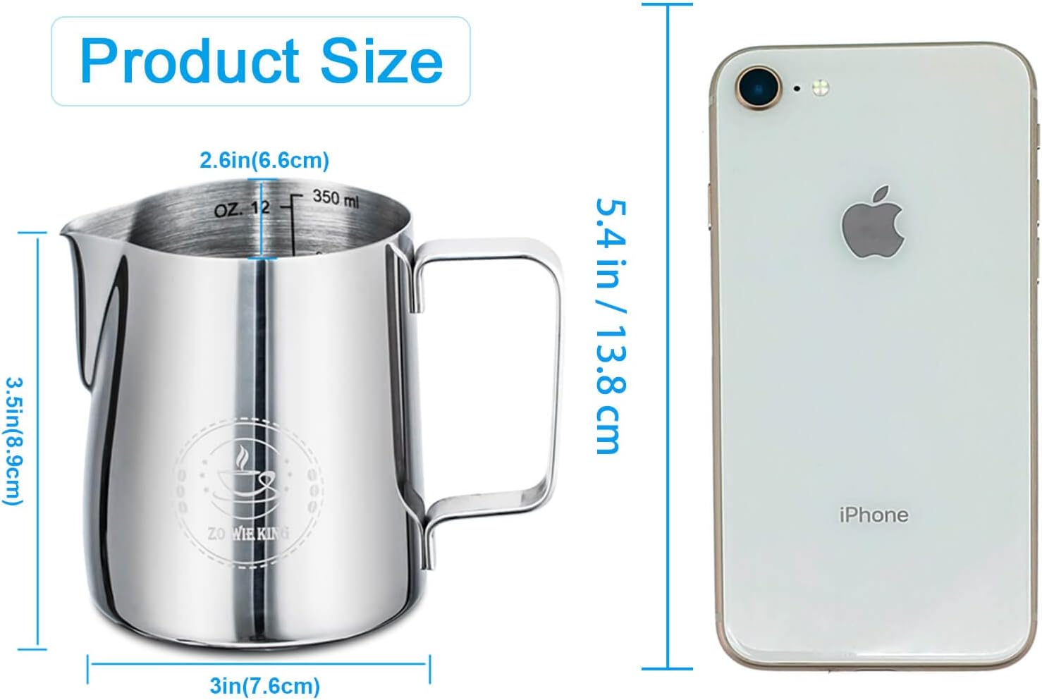 ☕【Convenience & Accuracy】This precise capacity of 12oz milk frother pitcher has engraved the liquid measurement on both sides, makes it easy to read, it is perfect for 1 or 2 cups of cappuccinos or espressos needs.