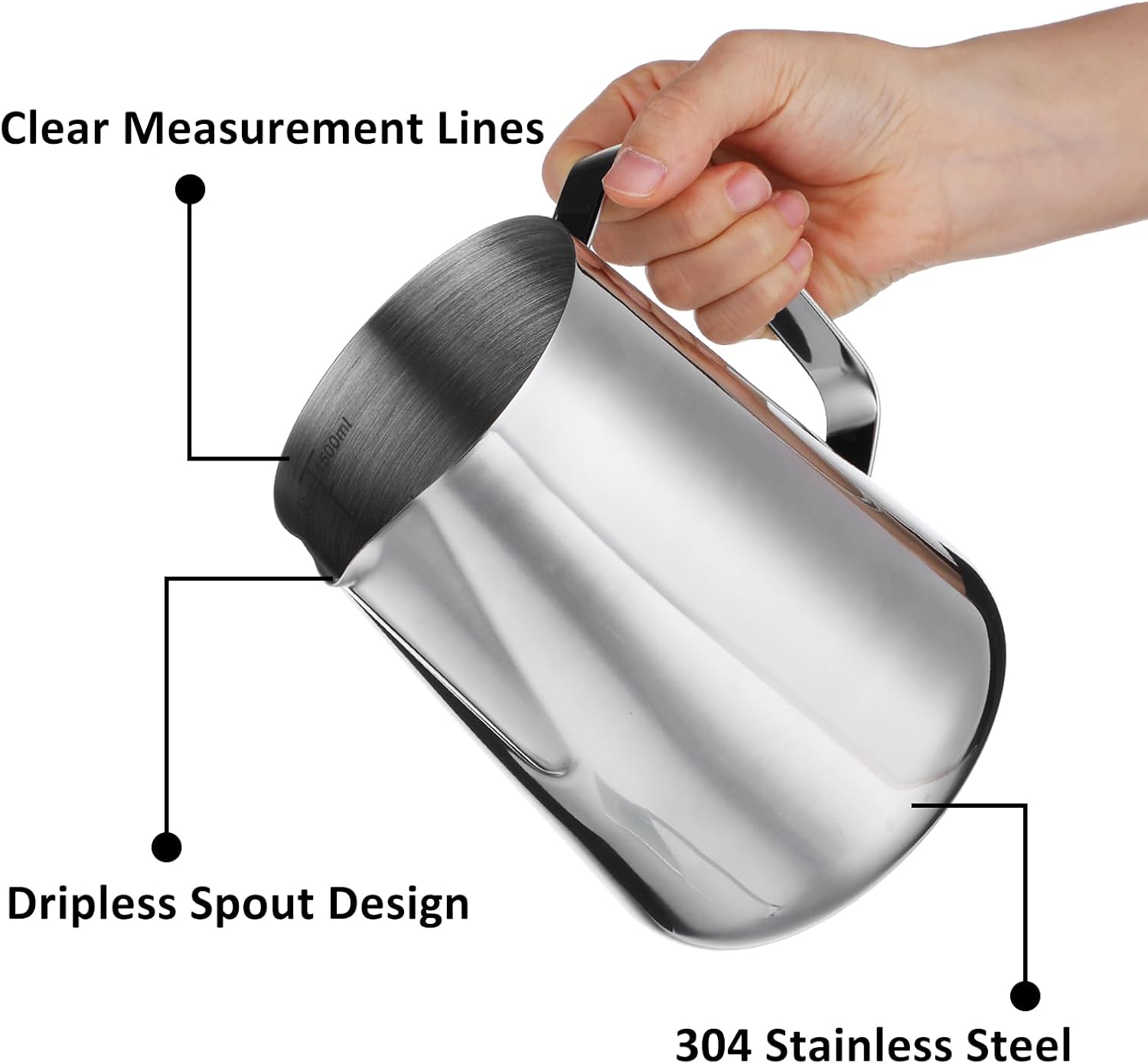 This milk jug has engraved the liquid measurement on one sides, makes it easy to read, and hand-held frothing milk pitcher helps you to control the strength of your hand, so that you can focus on the latte art as well