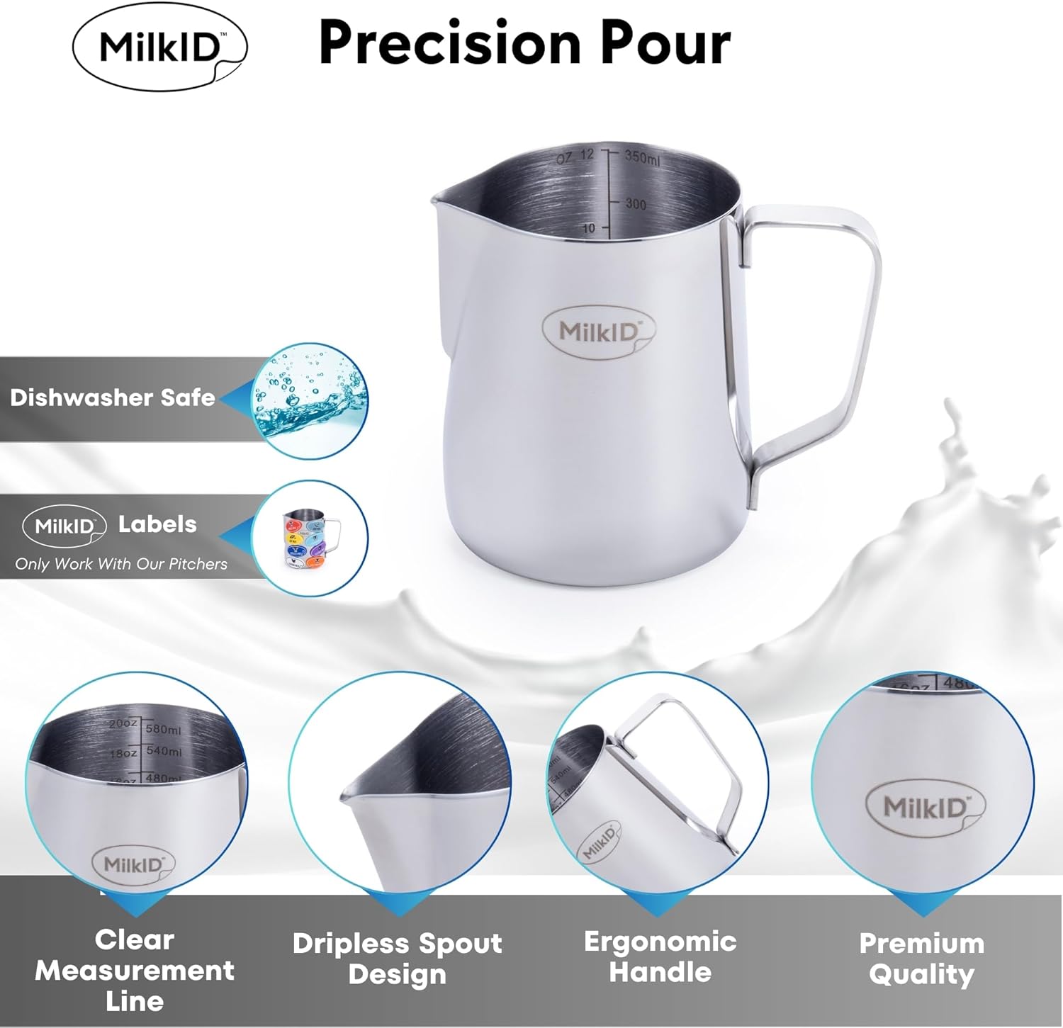 *DISHWASHER & HEAT RESISTANT*: Stainless steel pitcher & labels are dishwasher-proof & heat-resistant, ensuring durability & easy cleaning. Compatible with any milk steamer and frother for latte art.
