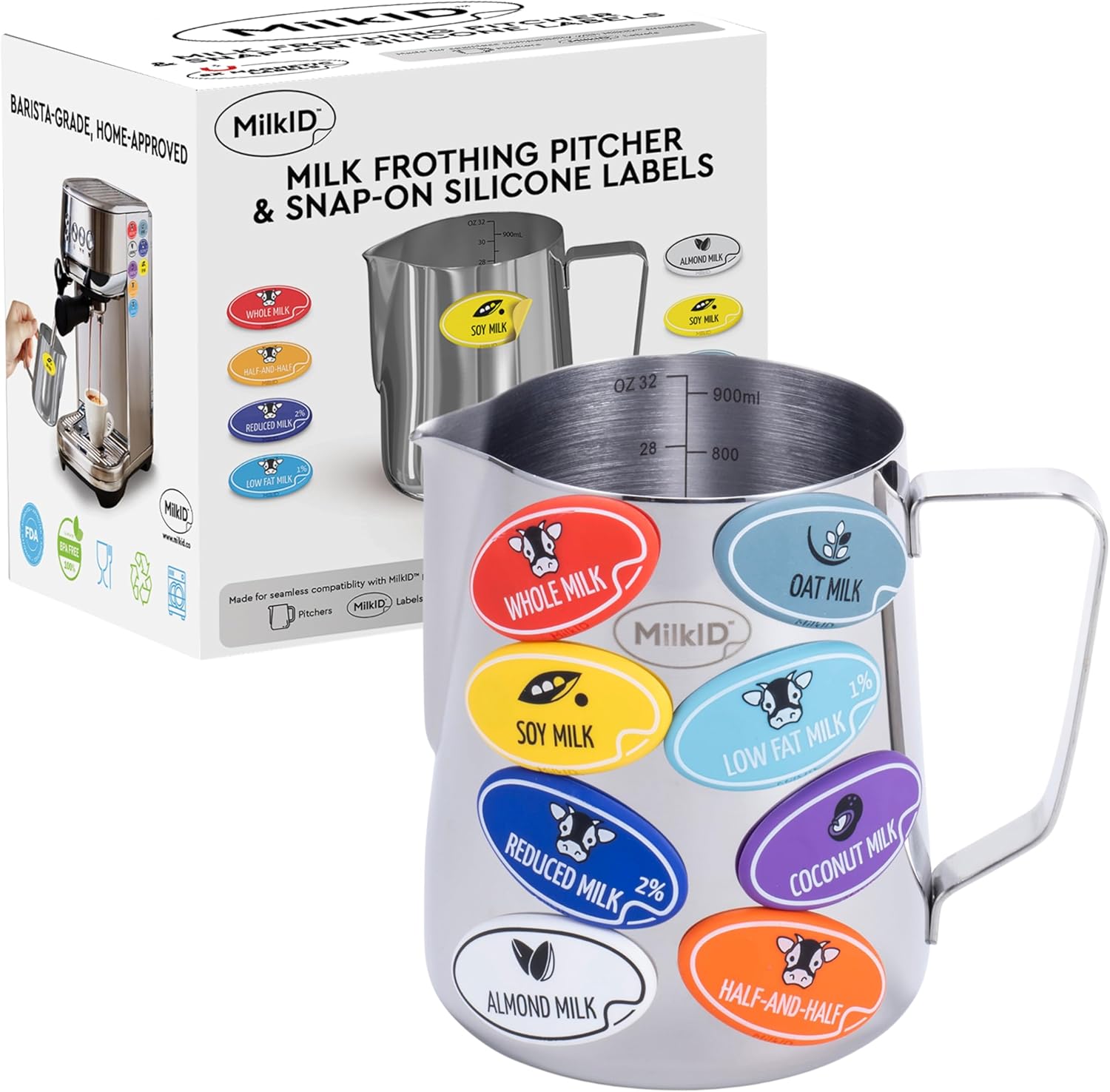 Milk Frothing Pitcher with 8 Allergen Silicone Snap-On Labels | Must-Have Barista Tool | Coffee Bar Accessories & Espresso Accessories Kit | (32oz / Pitcher + Labels)