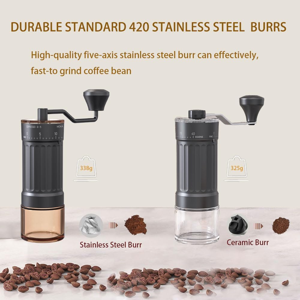 40 Gears External Adjustable: External adjustment ring with 60μm per click, optimized for espresso,Moka pot ,pour-over , and French press