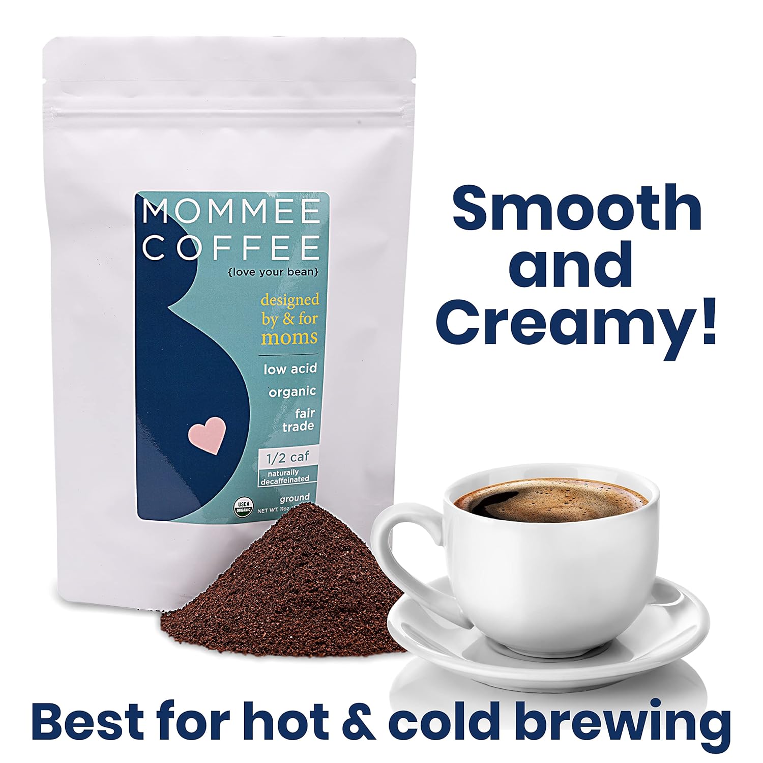 Mommee Coffee Half Caf Ground Low Acid Coffee – 100% Arabica Organic Coffee Beans with Smooth Caramel Flavor – Medium Grind for Drip, Reusable One Cup Filters – 11 oz