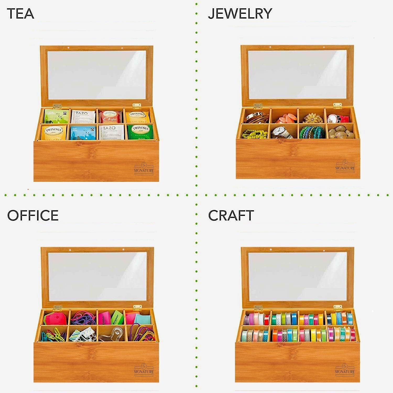 FANCY DISPLAY: This Natural Bamboo Tea Bag Organizer is elegantly crafted with bamboo body and sturdily framed lid with shatterproof acrylic glass to keep your teas fresh for months and lets you know when it’s time to restock your tea bags variety pack. A classic way to display all your favorite tea. Be sure to impress your dinner guests and friends!