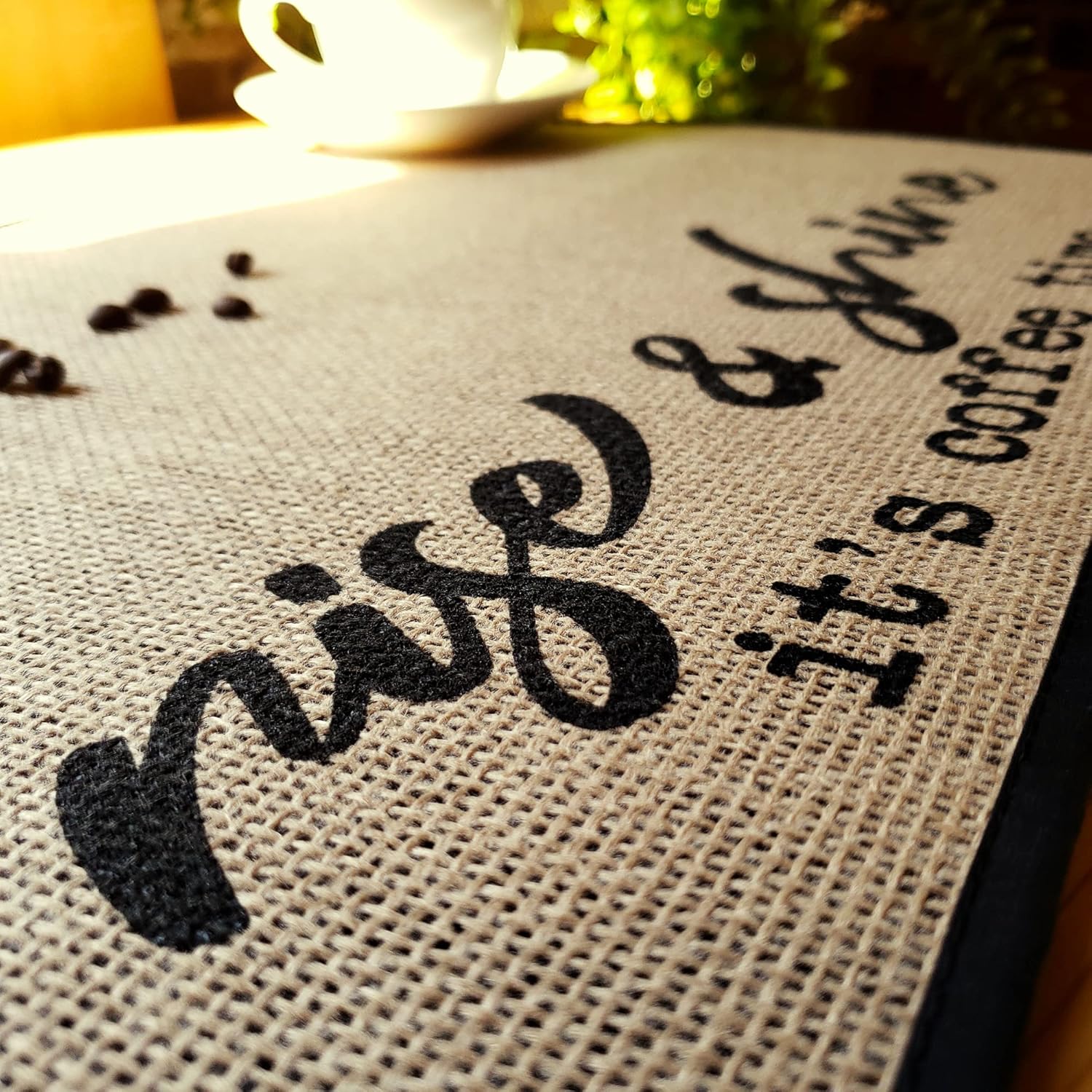 New Mungo Coffee Bar Mat – Accessories for Decor – Coffee Decor for Coffee Station – Rise & Shine It’s Coffee Time – Burlap Placemat with Fabric Backing – 20”x14”