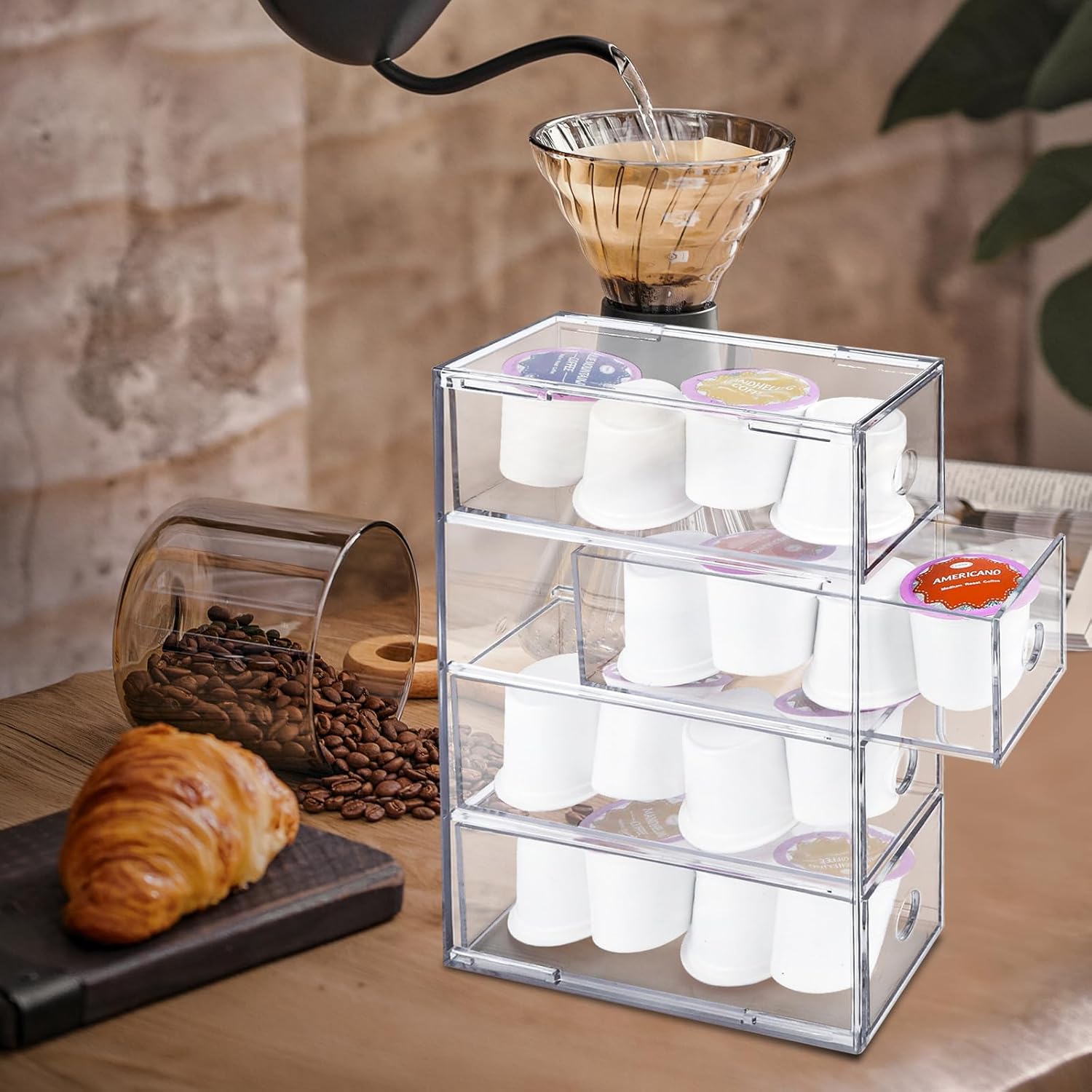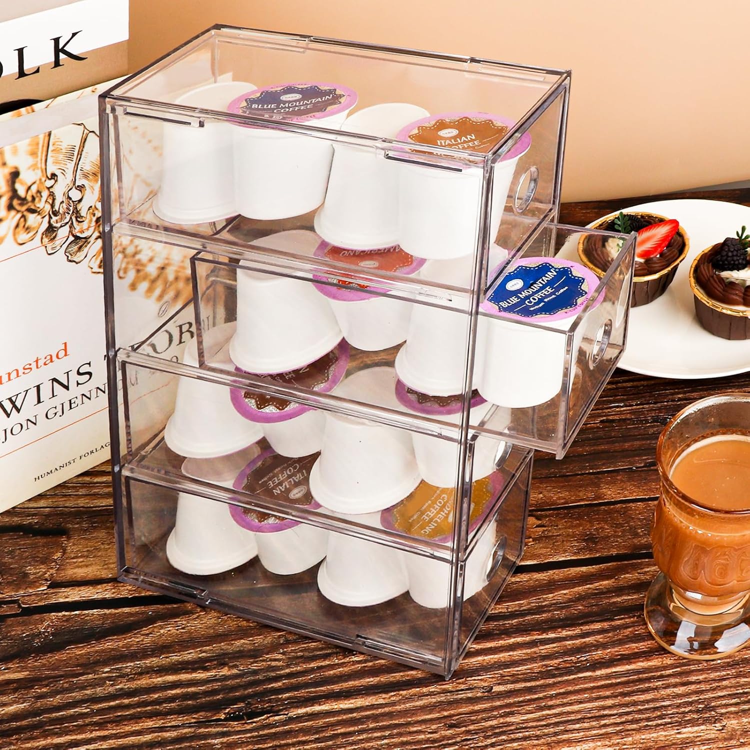 NOKI Acrylic Coffee Pod Holder – Clear K Cup Organizer with 4 Drawers, Coffee Pod Organizer for Espresso, Vertuo, and K Pods, Coffee Capsule Holder for Coffee Bar Station Counter