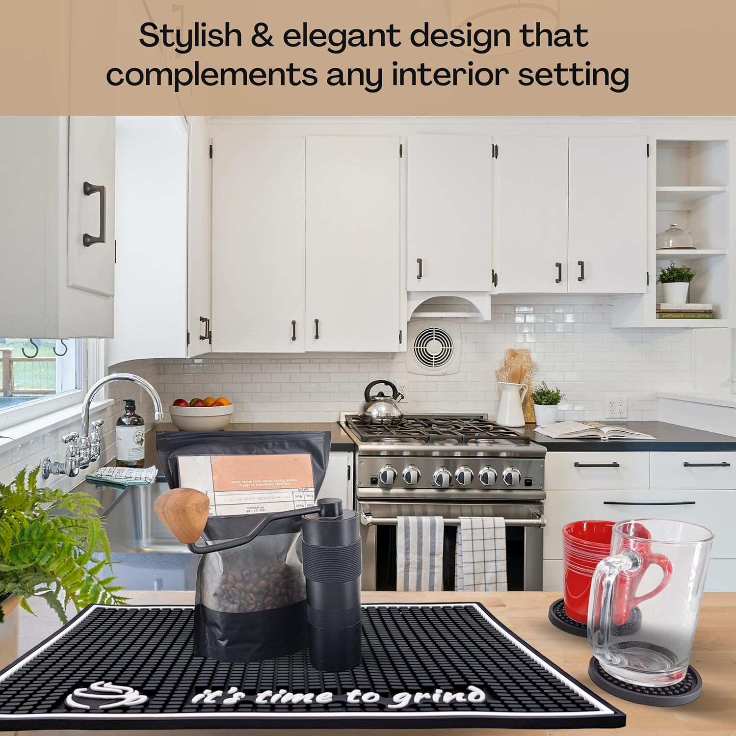 Chic & Functional Elegance: Transform your coffee haven with our sleek mat. Its chic design complements kitchen accessories, adding a touch of sophistication to your brewing space.