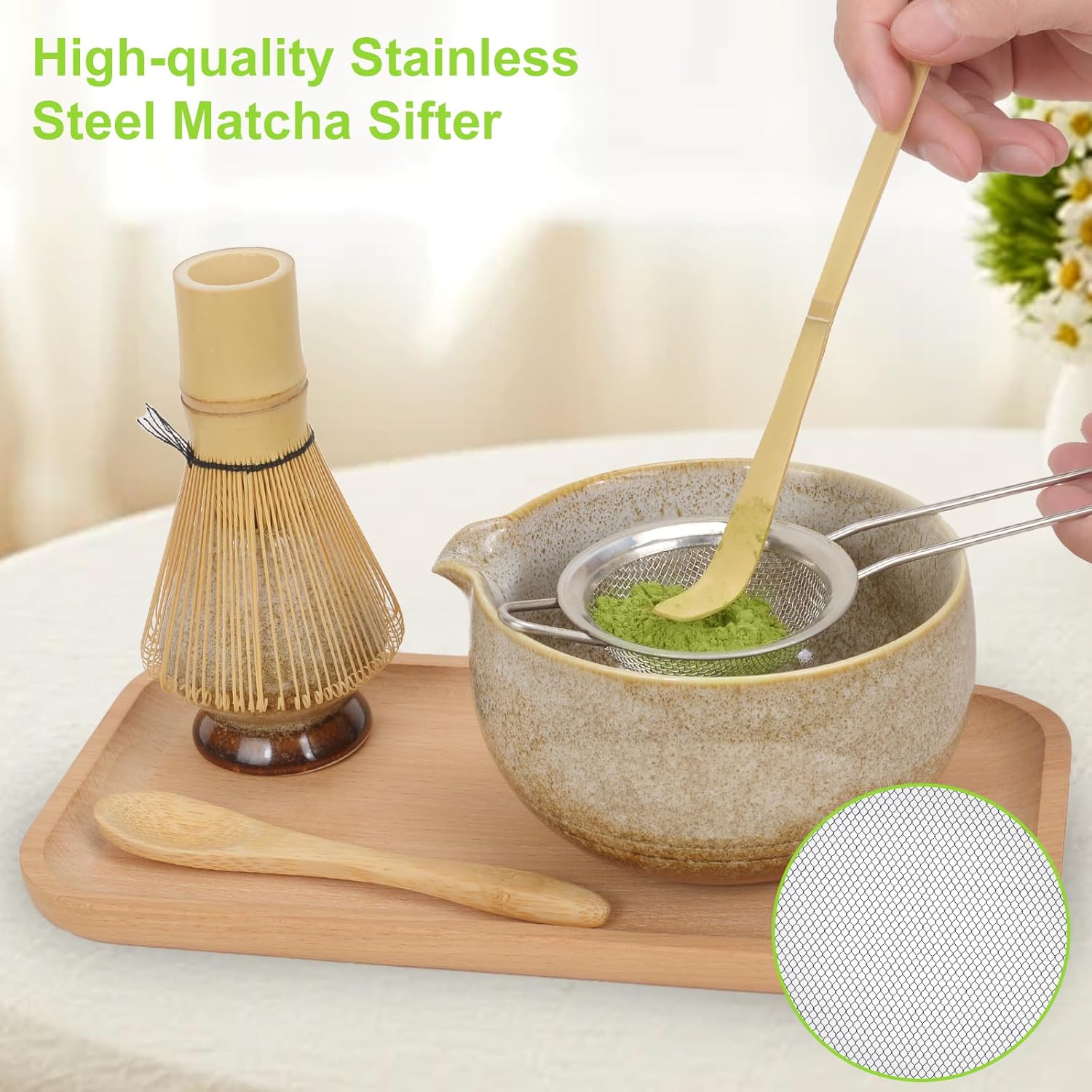 4-Piece Matcha Tool Set: Numola exquisite matcha whisking set includes a finely crafted whisk; tea spoon; tea scoop; stainless steel sieve. The whisk is meticulously woven with 76 fine tines, effortlessly creating a delicate foam. The union of a natural spoon and a sieve facilitates the easy grinding of tea powder into a fine texture