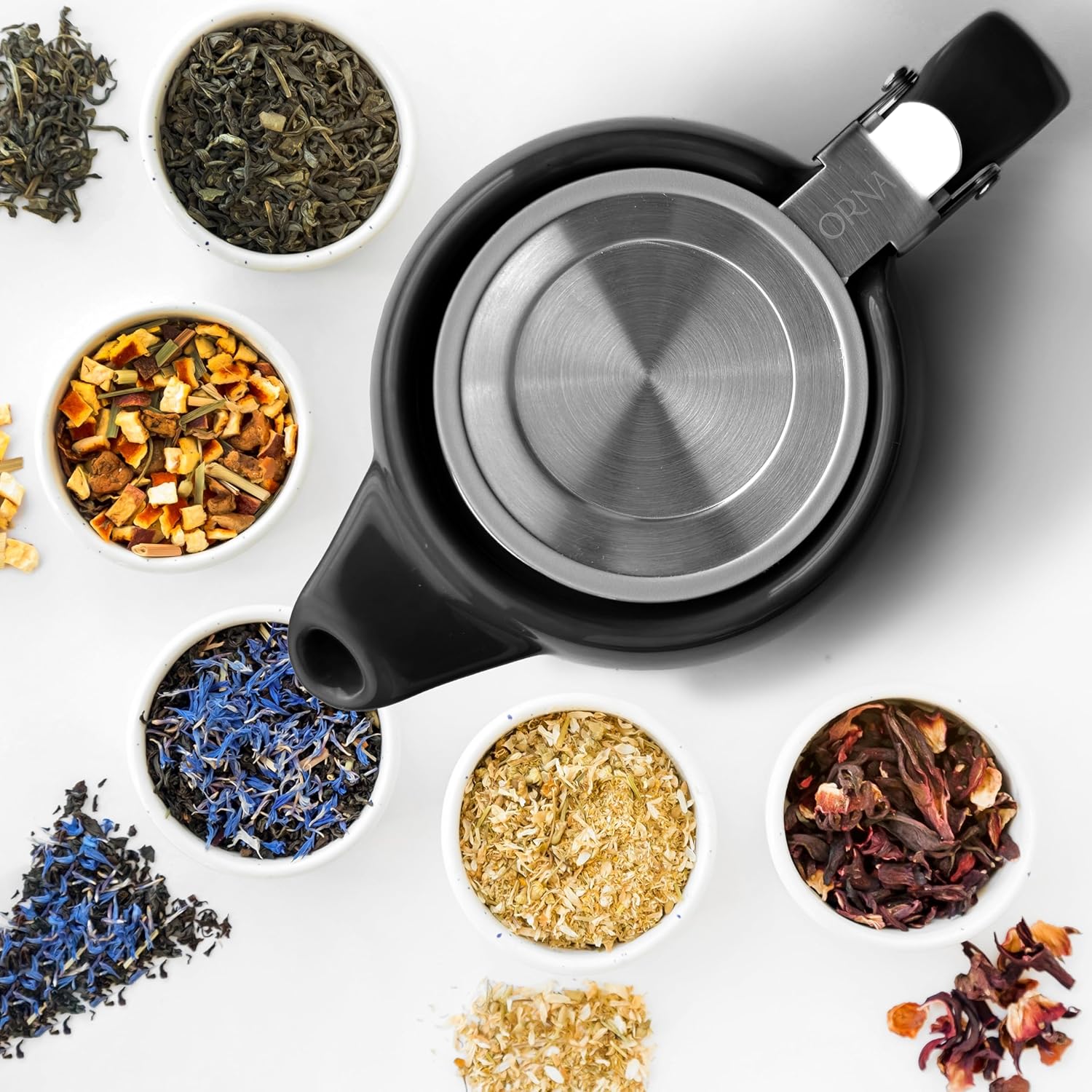 ORNA Ceramic Teapot with Tea Infuser – Small Tea Pot for Loose Leaf Tea – 550ml / 18.6 Oz Porcelain Non-Stove Teapot for 2 Cups with Tea Strainer (Black)
