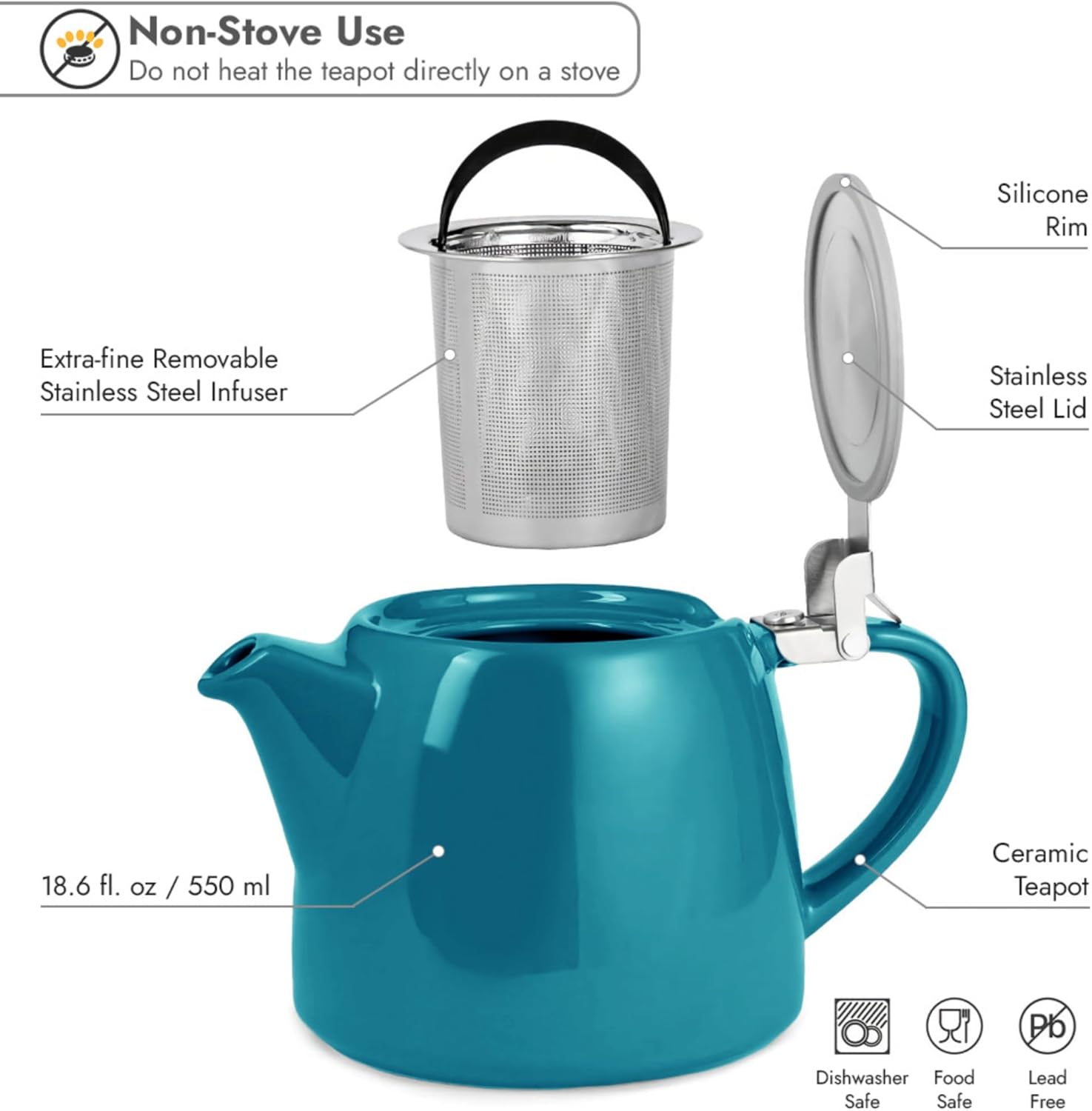ORNA Ceramic Teapot with Tea Infuser – Small Tea Pot for Loose Leaf Tea – 550ml / 18.6 Oz Porcelain Non-Stove Teapot for 2 Cups with Tea Strainer (Ocean)