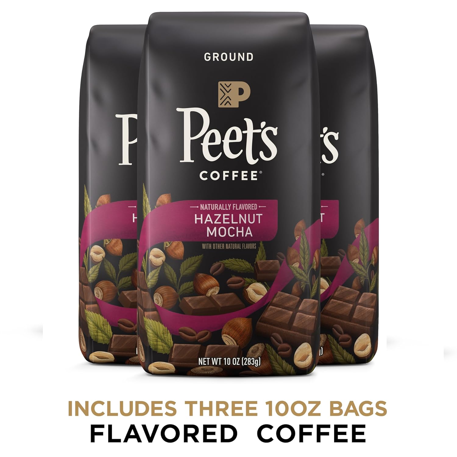 Contains three (3) 10 Ounce Bag of Peet’s Hazelnut Mocha Flavored Ground 100% Arabica Coffee.