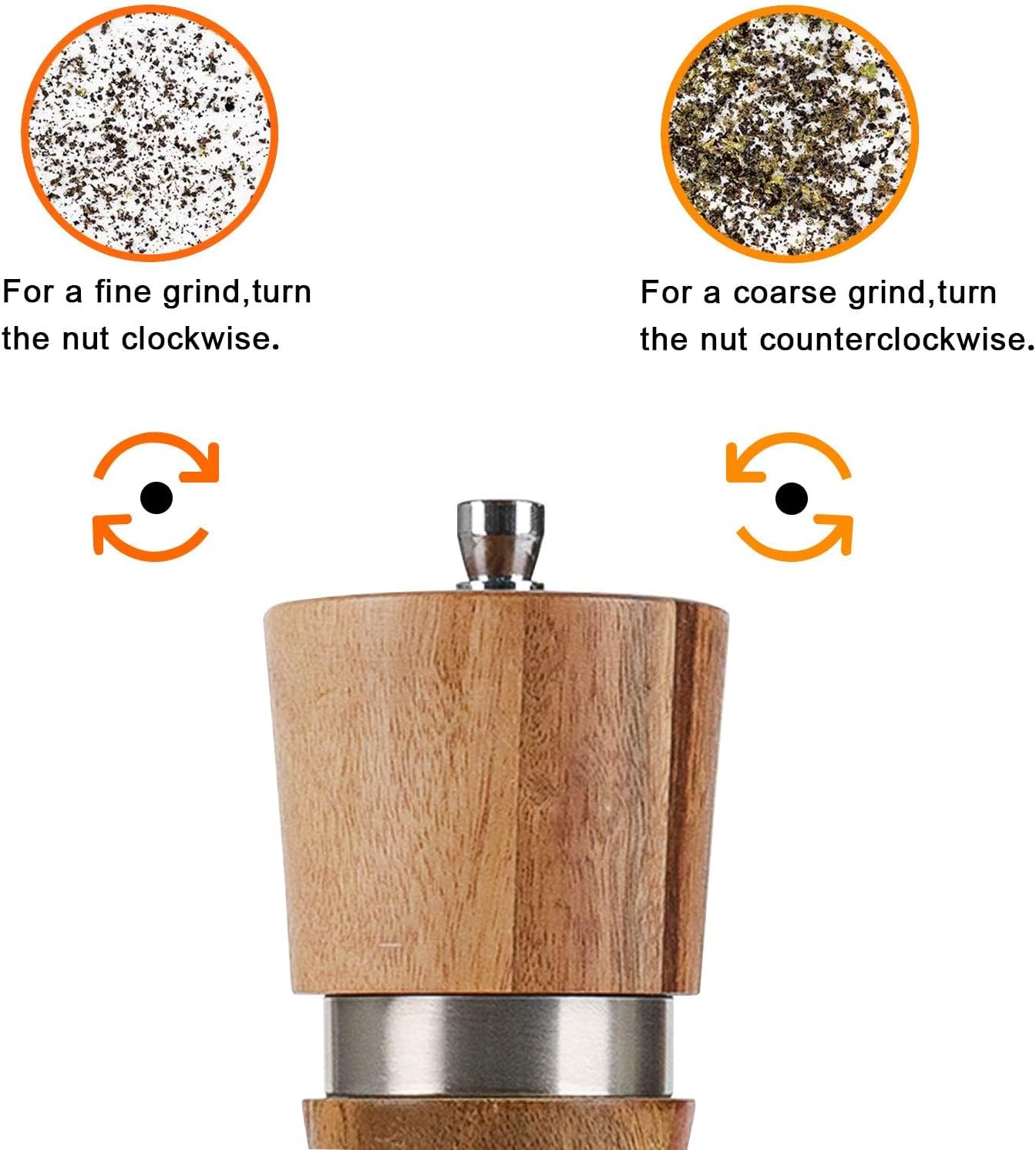 【Adjustable & Easy to Use】 Each of VanlonPro professional pepper mill contains an efficient adjustable, it is easy to adjust by twisting the nut at the top of the grinder from loose to tight to get the desired spice fineness according to your needs, counter-clockwise for more coarse, clockwise for fine.
