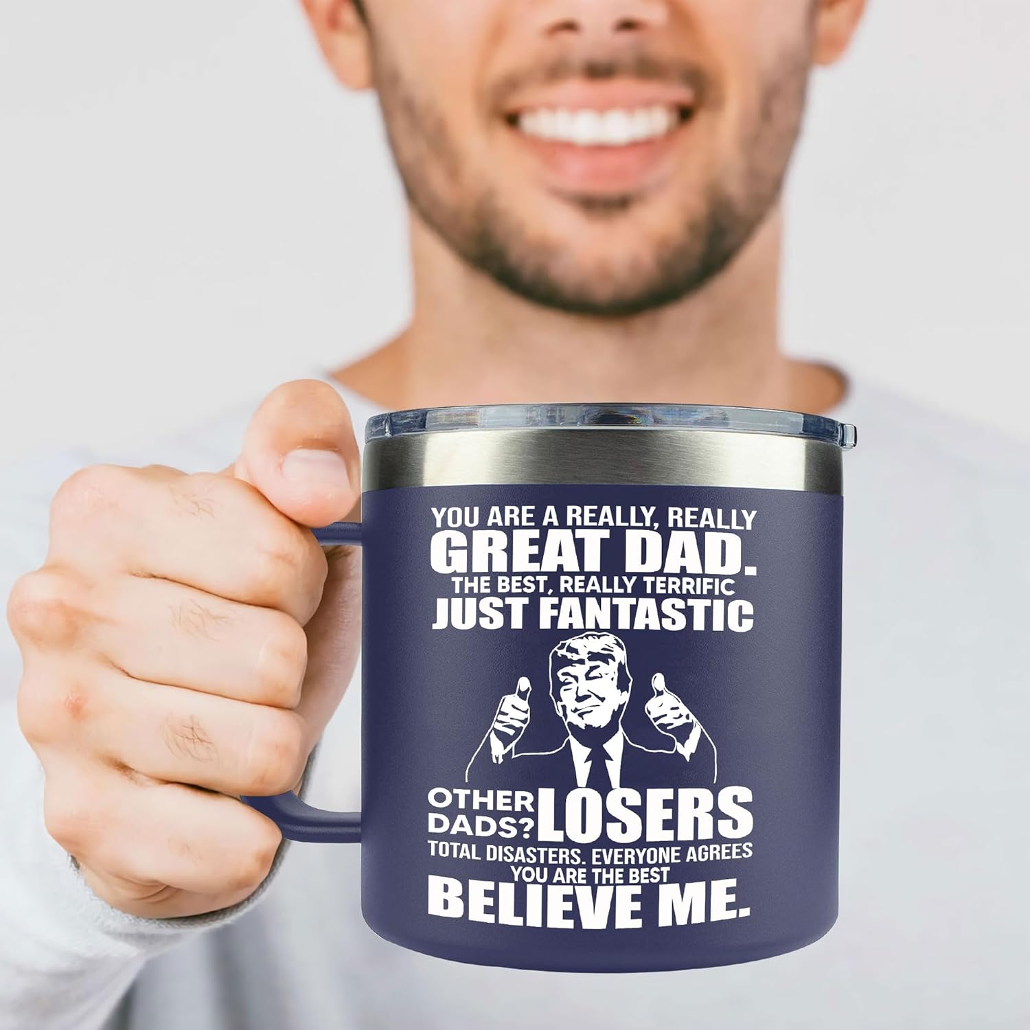 I gave this to my fiancee for Father’s Day. He doesn’t like Donald Trump. It’s hilarious. He keeps this coffee mug at work. He has an excellent sense of humor, so I expect he uses this frequently and proudly.A few years ago, I bought my dad a similar item on Father’s Day because he loves Trump. The gift is perfect for anyone.It’s also really good travel mug quality and keeps coffee warm for a long time.
