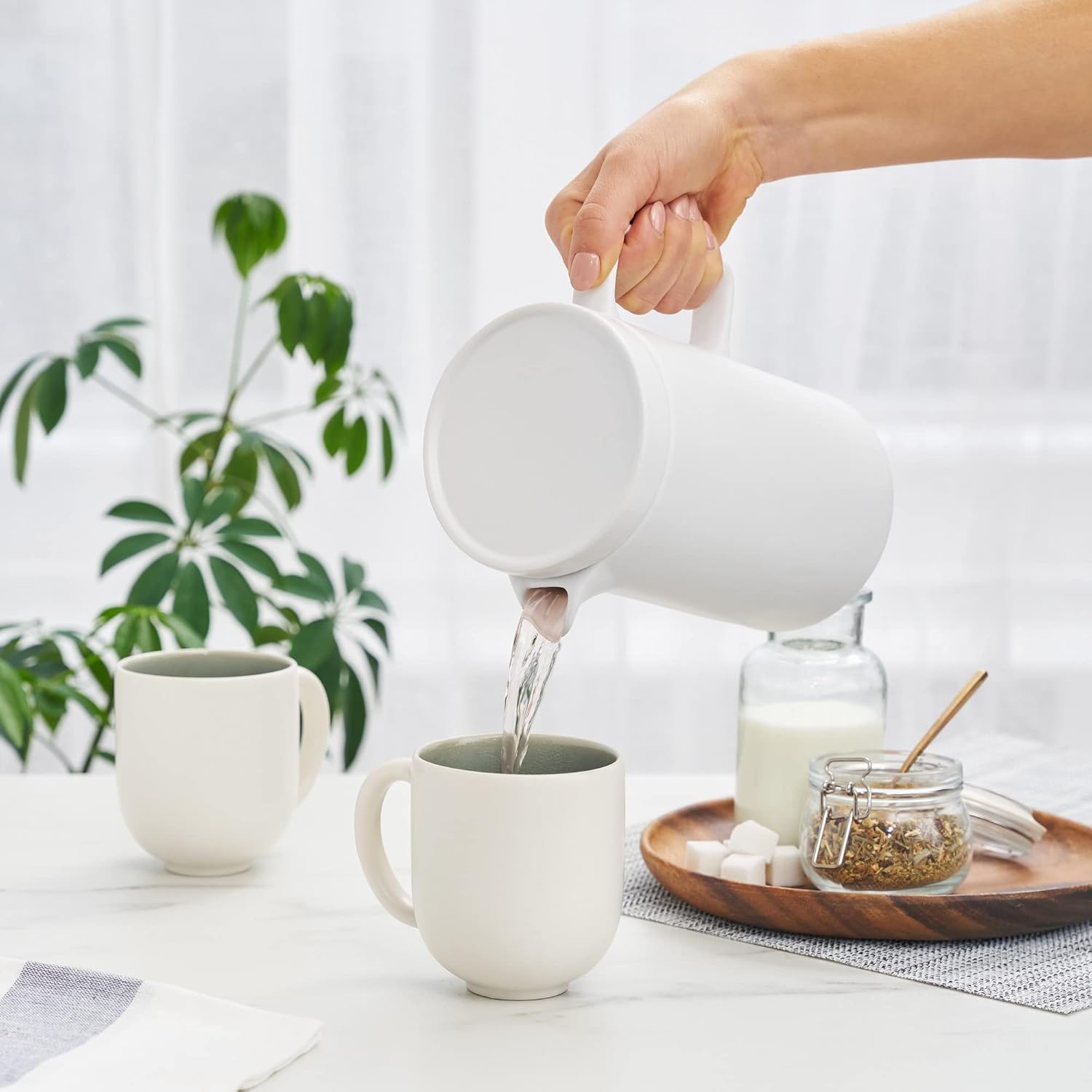 The Jona Teapot is perfect for modern tea drinkers. Its minimalist silhouette, gorgeous matte stoneware, and large stainless steel infuser basket make brewing your favorite loose leaf tea simple and elegant. The Jona Teapot holds 42 oz. and makes approximately 5 cups of tea, and includes a lid with a lip to keep it in place while you pour. Bring contemporary style to timeless daily rituals.