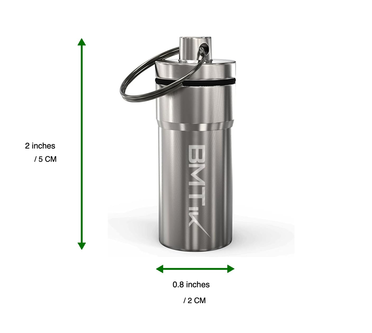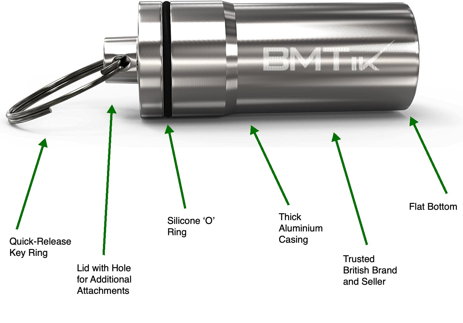 Each capsule contains a key ring, a lid with a hole for additional accessories, a silicone ‘o’ for smell prevention, and machine pressed aluminium body with flat bottom for standing.