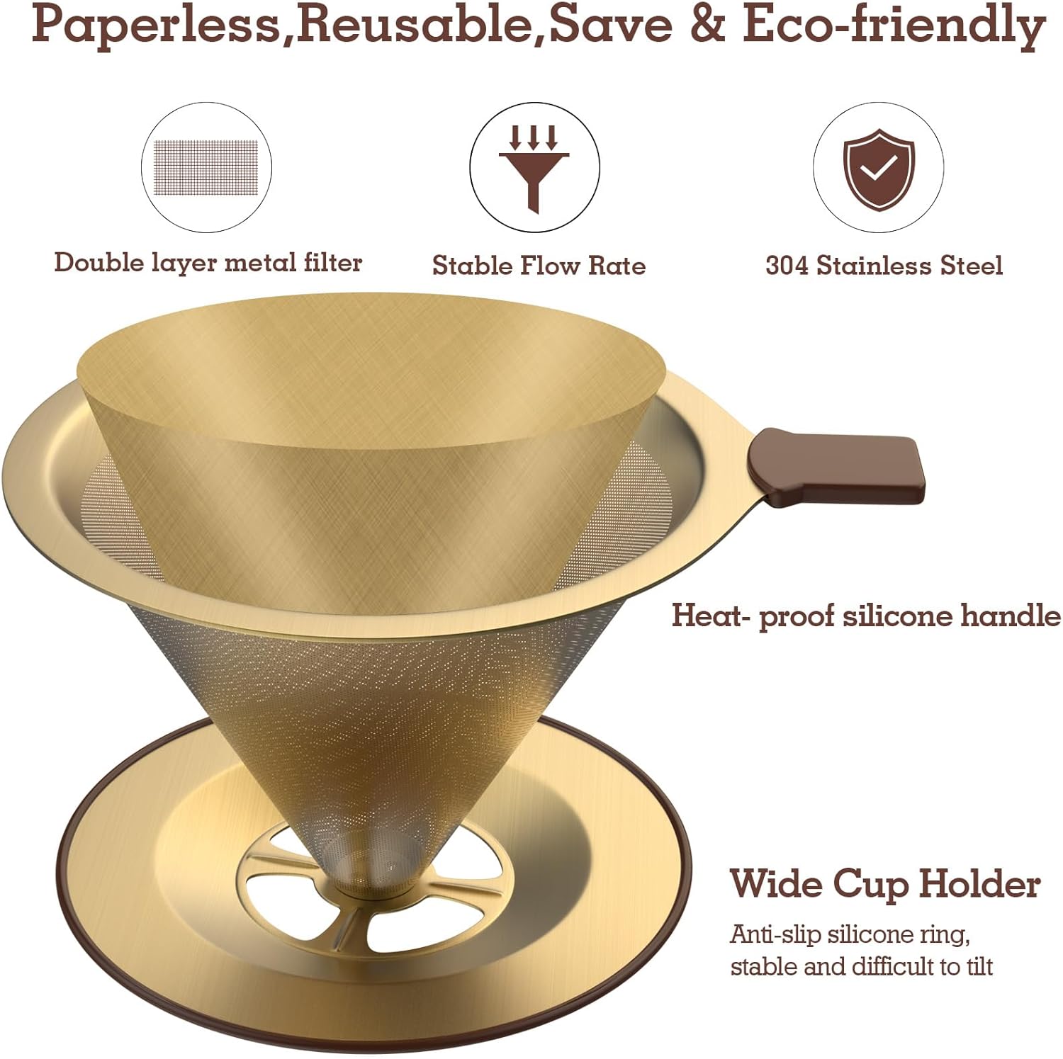 Pour Over Coffee Dripper,Paperless Stainless Steel Filter, Reusable Stainless Steel coffee filters,Fine Mesh Double Layer,With Non-slip rubber ring & handle, Pour Over Coffee Maker