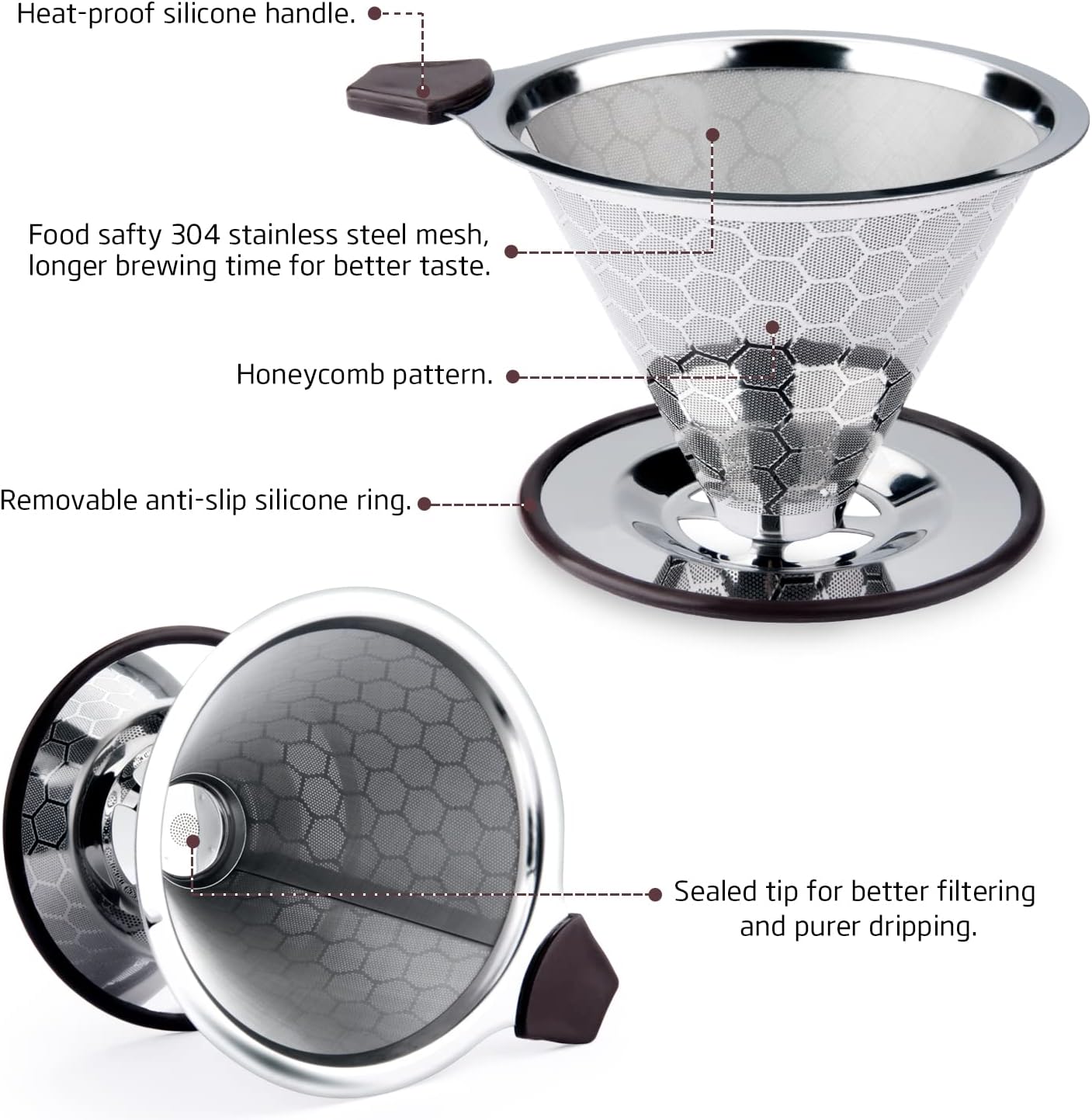 Materials: 304 stainless steel & silicone Dimension: 18.4 * 8.8 * 10CM Design: honeycomb Weight: 180g Make 1 ~ 4 cups of coffee Make an individual coffee Easy maintenance Goodbye to waste paper