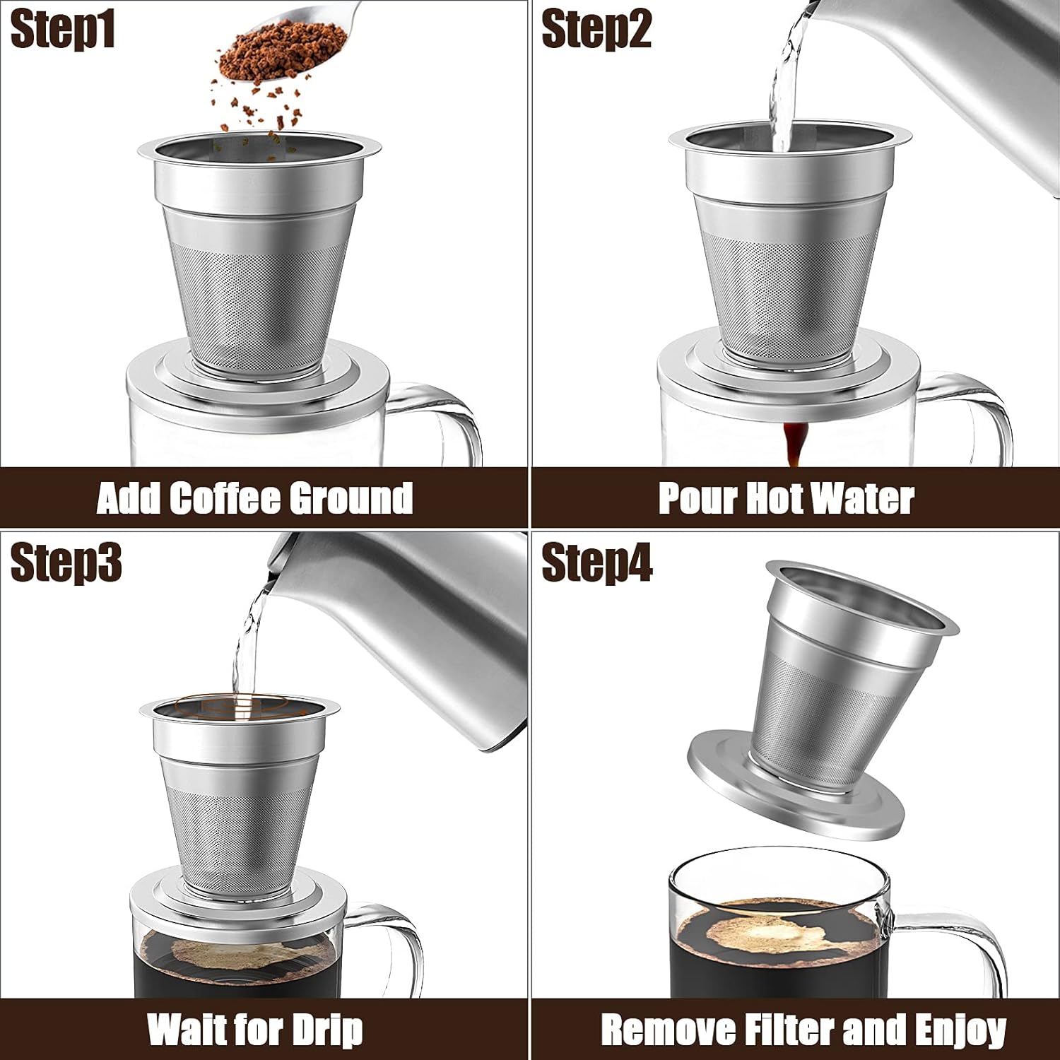 Add medium-fine (Fresh is better) ground coffee to the filter.Heat water to just below boiling point (185℉~197.6℉). Slowly pour water over coffee.Wait 30 – 45 seconds for coffee to slowly drip. For the best flavor, let coffee brew for 4 minutes.Remove the filter. Drink directly with a glass cup.