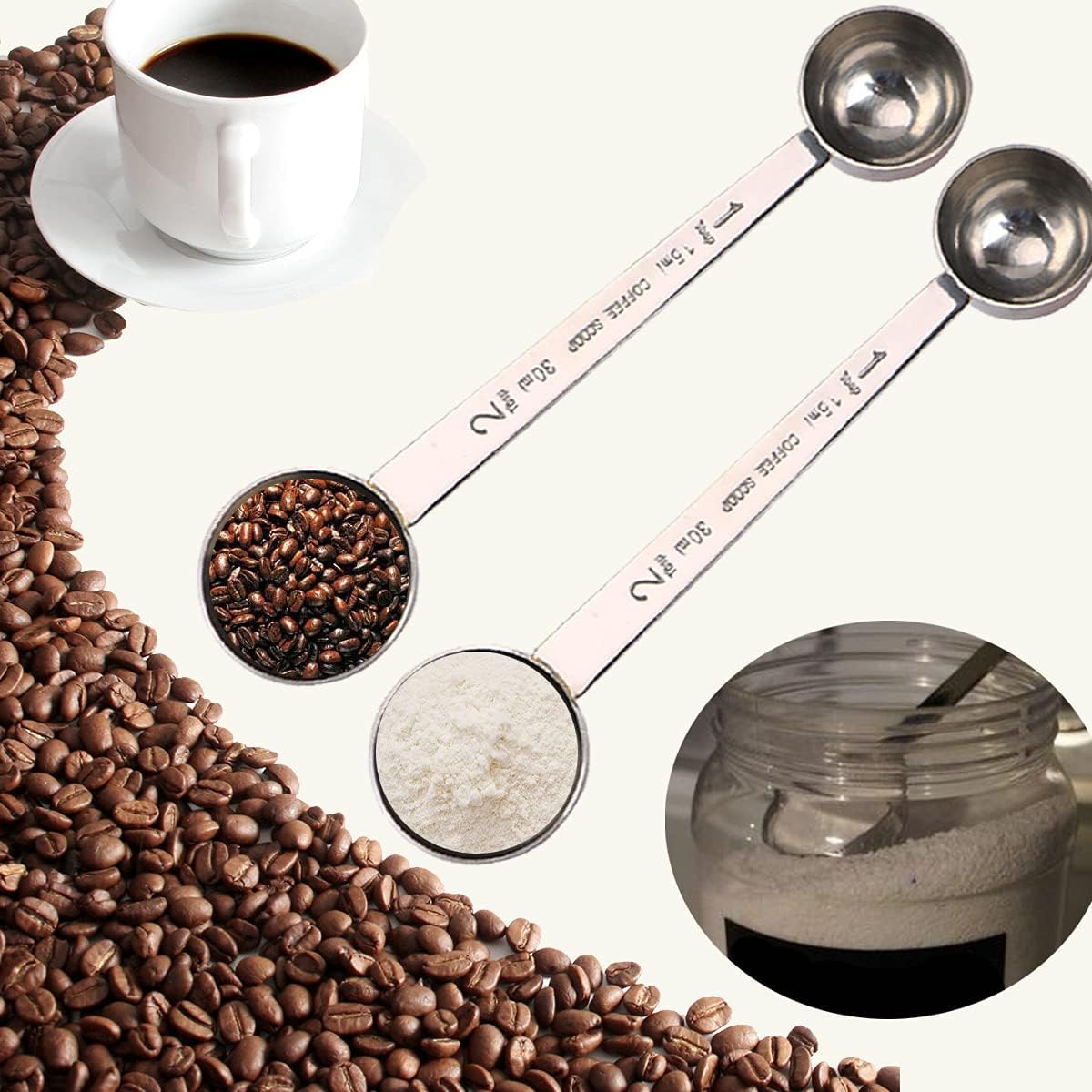 It is very suitable for measuring coffee powder, cocoa, tea, sugar, flour, protein powder and other products. Accurate measuring spoon, two scales of 30ml and 15ml