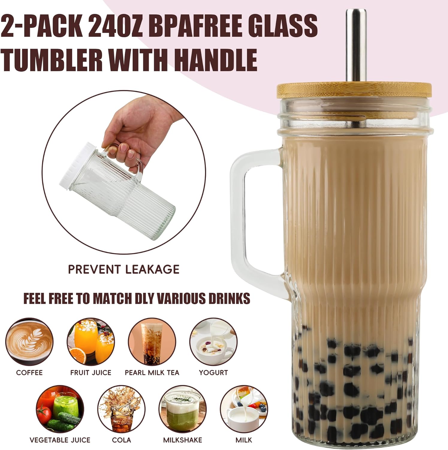 Glass cups set includes 2 Wide Mouth Mason Jar 24oz, 2 nature bamboo lids, 2 reusable plastic lids, 2 reusable stainless steel straws, 1 cleaning brushes.The boba cup is made of high quality durable clear glass, Lead free and BPA free.This boba smoothie ice coffee cup fits perfect in standard car cup holders or carry around for travel.Fits any hot and cold drinks.