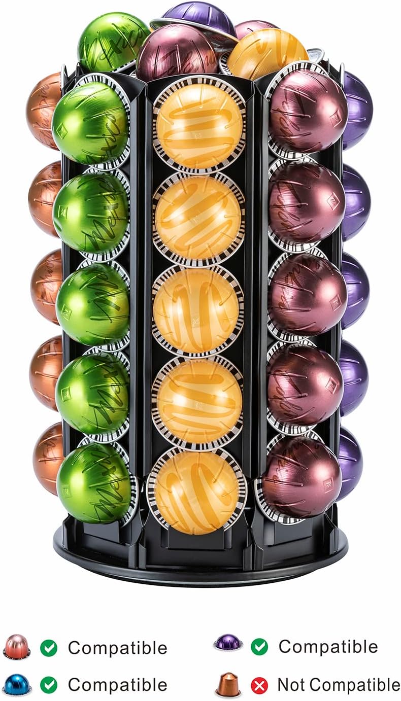 I’m pumped about this stand because it looks fantastic beside my Nespresso machine, with all the flavours (and their colours) displayed nicely, and its capacity is good keeps the pods looking tidy.The little space at the top is roomy enough for almost a whole sleeve of pods, so that’s a nice touch.Would buy again, and recommend this to anyone looking for easy access to their pods. Oh, and the stand spins effortlessly and silently. Everything is getting on my nerves these days–thanks, pandemic!–but not this. Lol.
