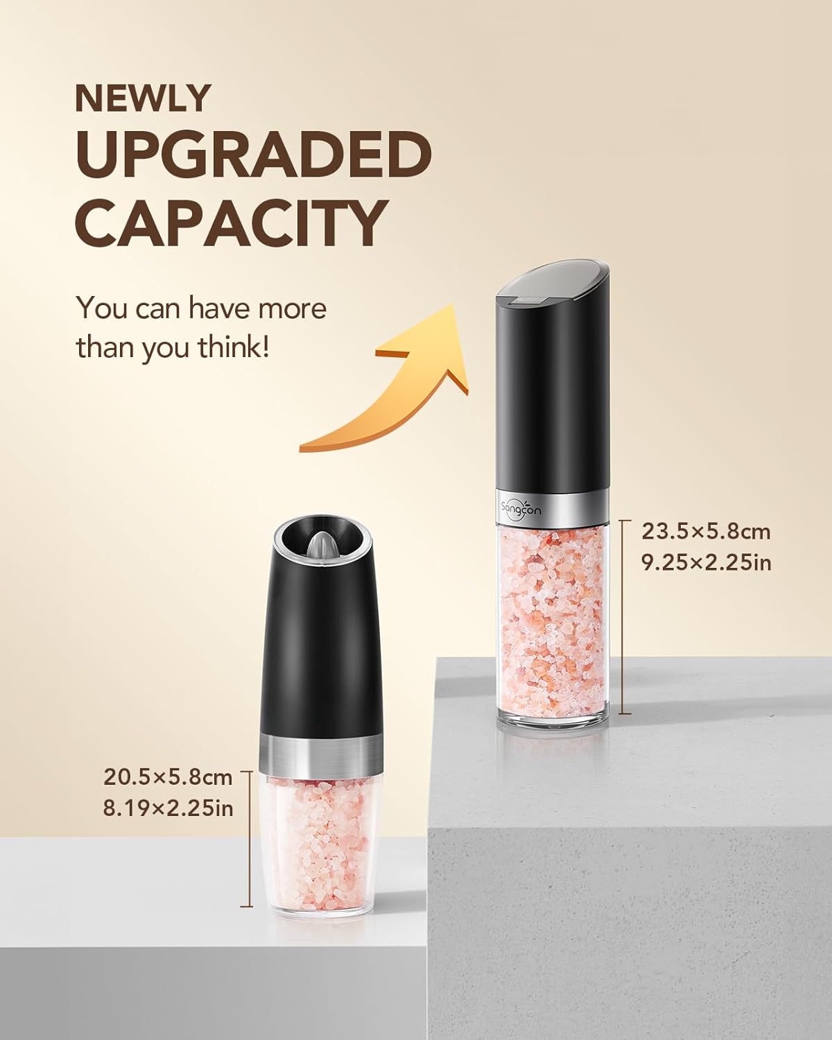 【Integrated Dustproof Cover】: The Sangcon salt and pepper grinder set includes an elastic dustproof cover, ensuring your spices stay clean and fresh. An LED light highlights the grinding process for precise seasoning, making it a standout among electric salt and pepper shakers.