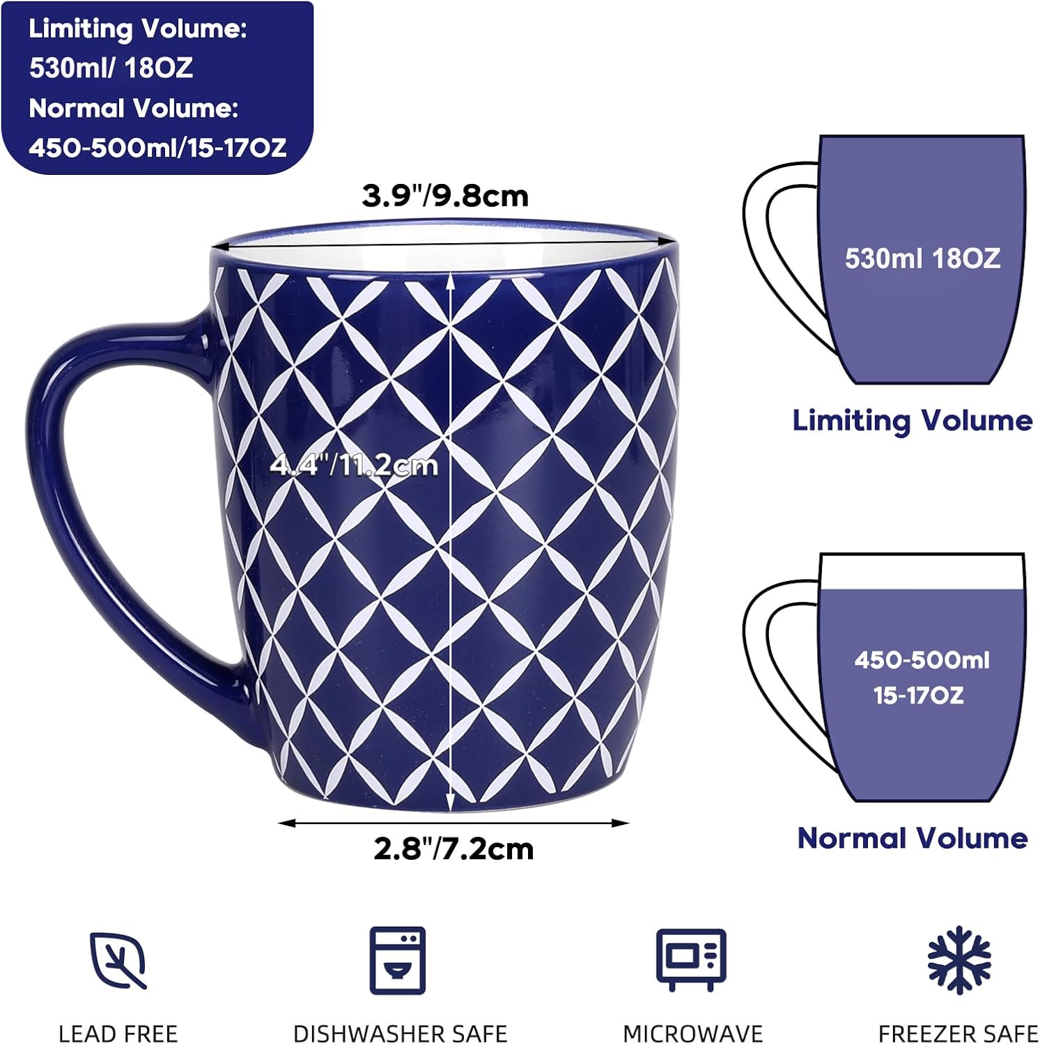 Large Porcelain Mug: Each blue coffee mug Limiting Volume is about: 17.9 OZ/ 530ml, Normal Volume is about: 15-17 OZ/ 450-500ml; Large coffee mug with plenty of space handles, so that for you to comfortable hold mug for coffee, tea, milk, water, and juice