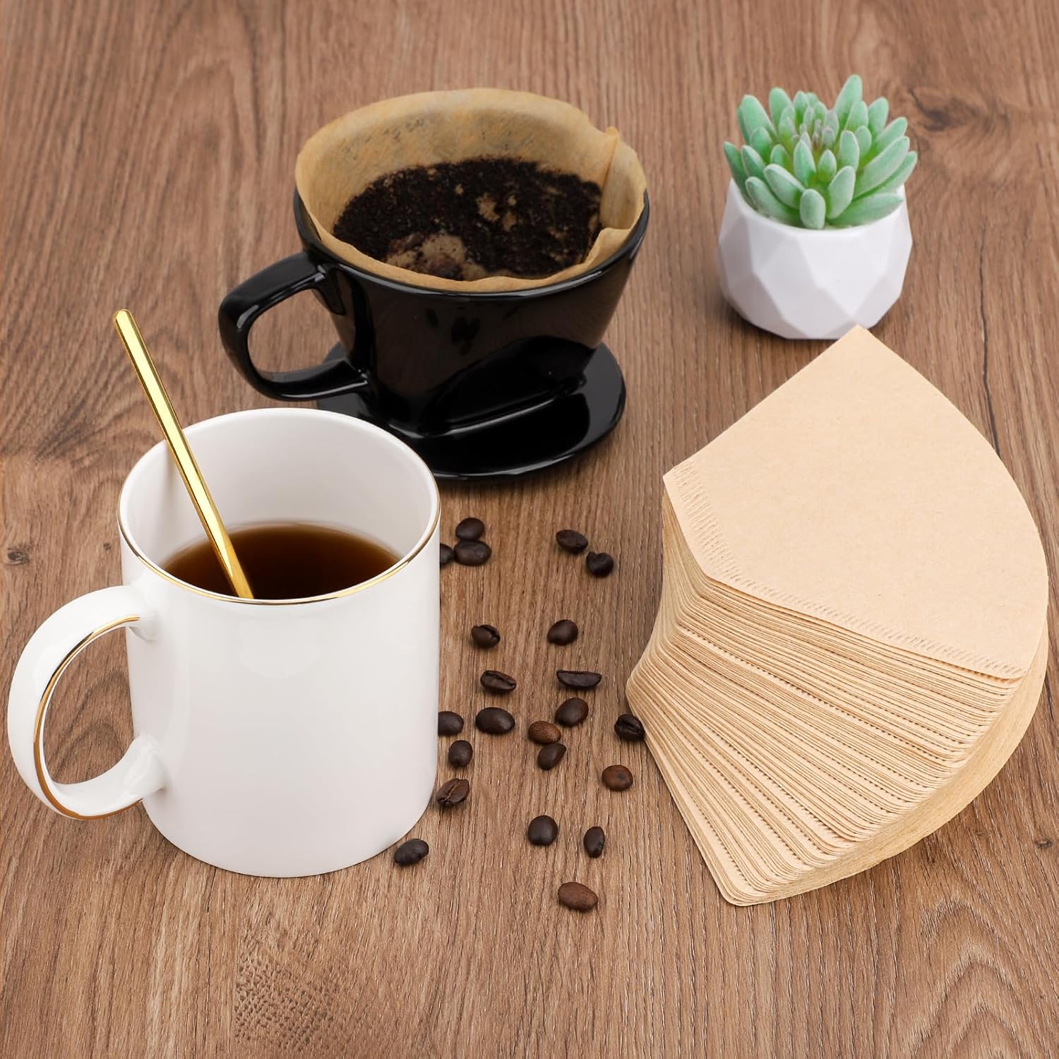 Segarty Pour Over Coffee Dripper Set, Black Ceramic Coffee Maker Single Cup, 100 Count Cone Filters, Gold Trim Coffee Mug with Spoon and Brush, 5 in 1 Hand Drip Pourover Kit for Home Morning Coffee