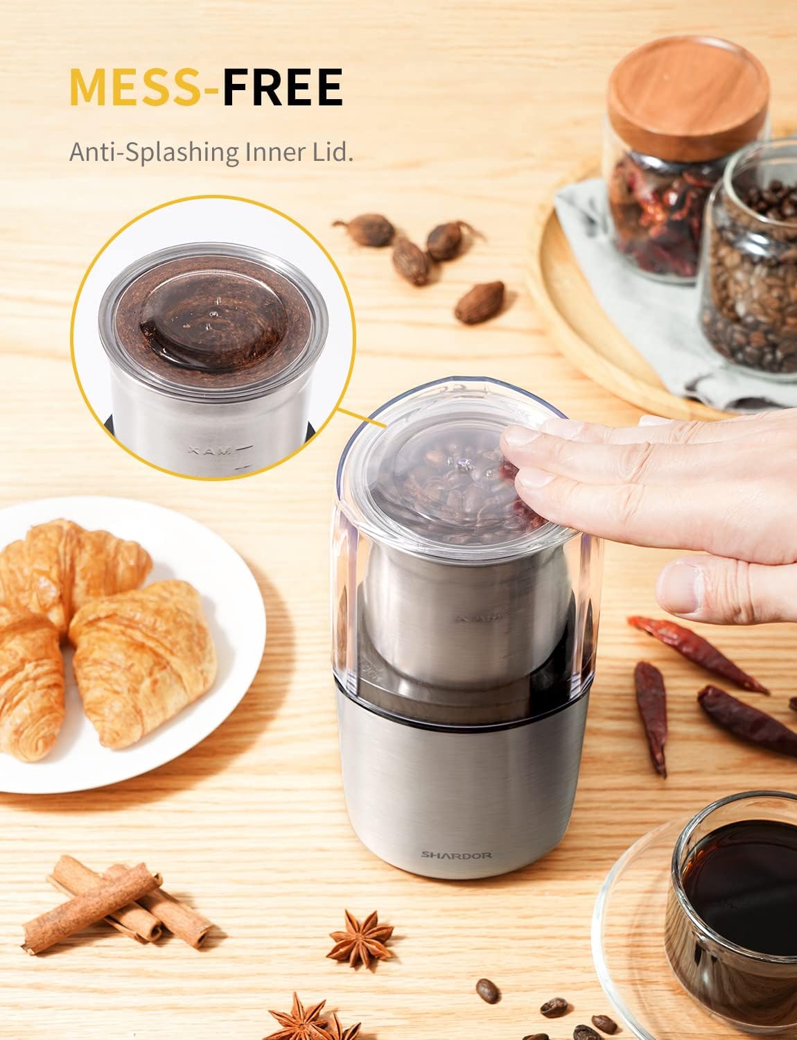 SHARDOR coffee and spice grinder is equipped with a small inner cover, which can effectively prevent the splashing of coffee powder and other ingredients during grinding.