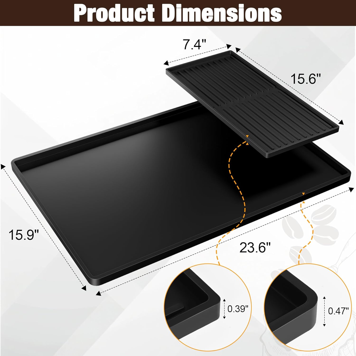 Spill Protection & Easy to Clean:Designed with a raised 0.4” edge,the coffee bar mat effectively contains spills and prevents leaks, safeguarding your coffee bar countertops. Effortlessly clean by wiping or rinsing.