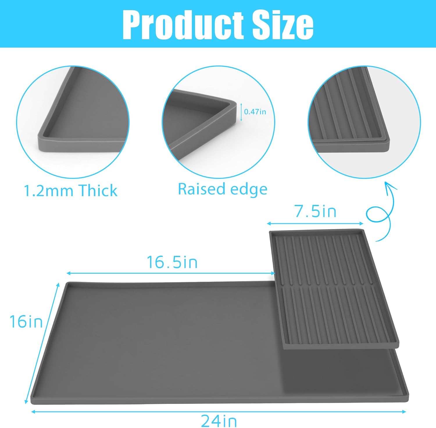 Silicone Coffee Mat with Raised Edge,24”x16” Coffee Bar Mat with Detachable Drying Mat,Coffee Bar Mats for Countertop Fits Coffee&Espresso Machine,Coffee Pots,(Grey)